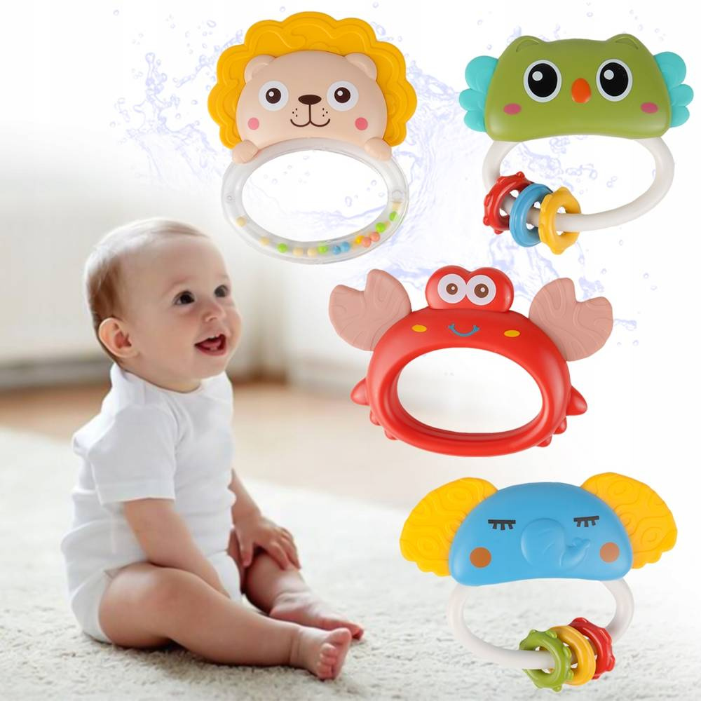 Zawieszki ze zwierzętami: lew, sowa, słoń, krab grzechoczą i można je zdjąć oraz używać osobno jako grzechotki.