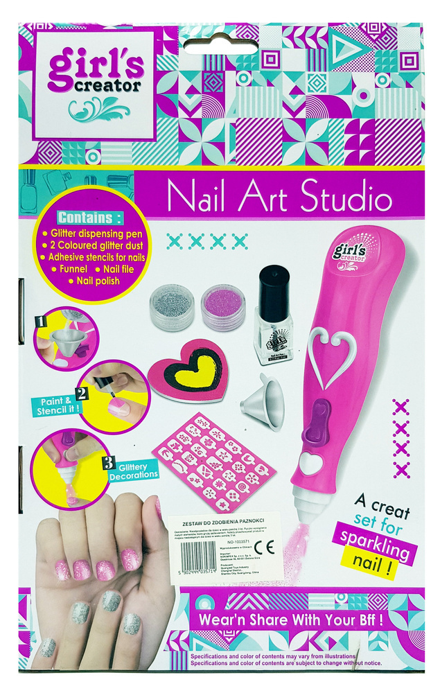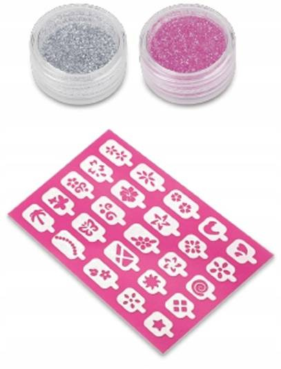 Mamy tu do dyspozycji lakier do paznokci i akcesoria do ozdabiania. Wszystko nietoksyczne i łatwe do usunięcia. Dziewczynki do stylizacji mogą użyć szablonów ze wzorami, brokatów w dwóch kolorach oraz długopisu do rozprowadzania.