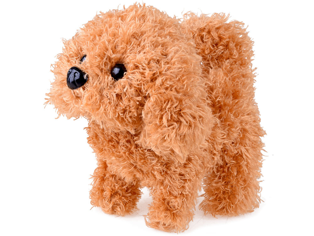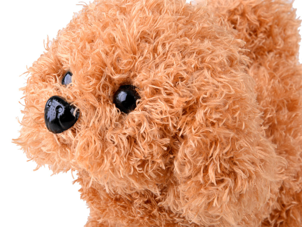 - pluszowy piesek w kolorze karmelowym z kręconym futerkiem, czarnymi oczkami i noskiem