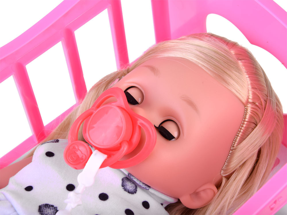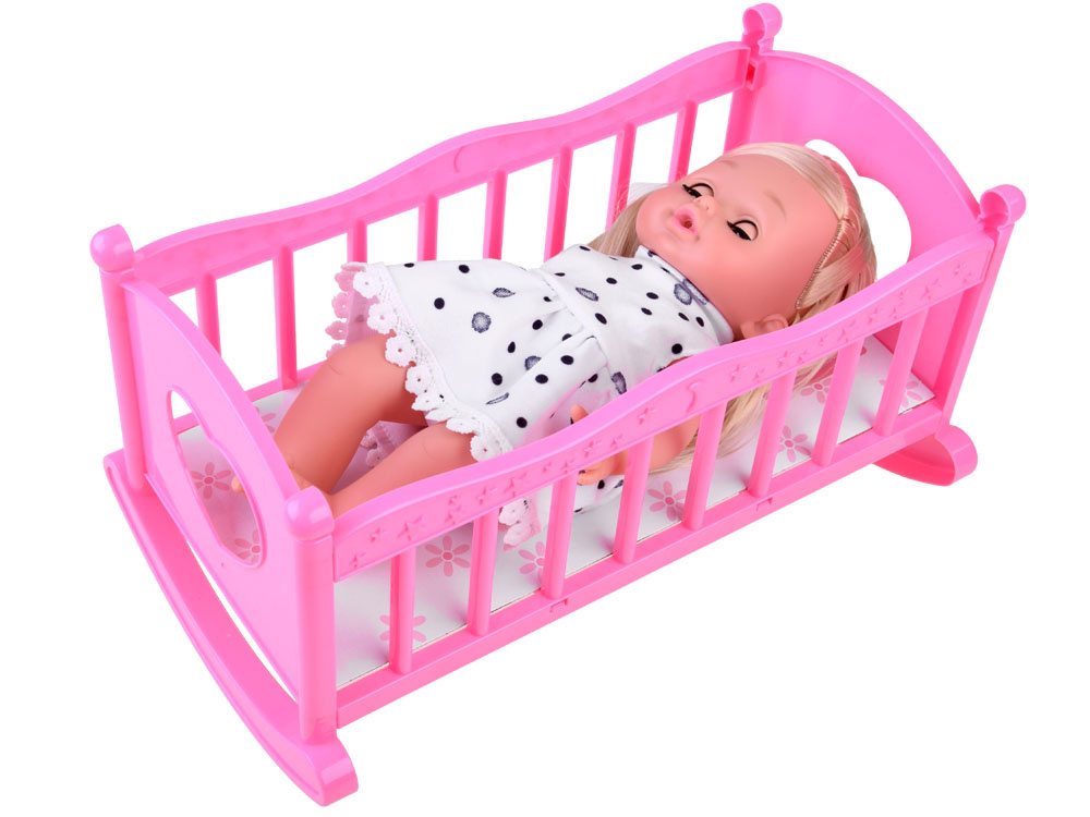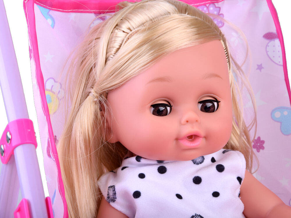 Po posiłku czas na drzemkę w wygodnej kołysce. Rama kołyski wykonana jest z tworzywa sztucznego, dno natomiast z grubego kartonu z kwiatową grafiką. Na różowej ramie kołyski wytłoczone są gwiazdki i księżyc. Po drzemce czas na spacerek w ulubionym wózku.