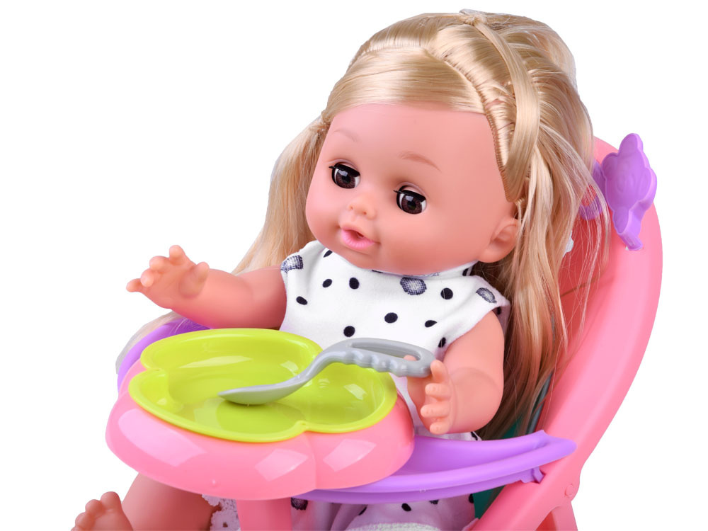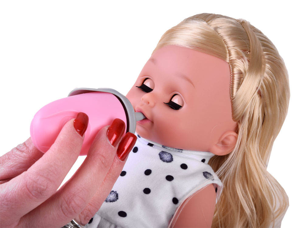 Lalkę można poić dołączoną butelką, posiada również funkcję siusiania. W zestawie znajduje się również pieluszka oraz nocnik, na którym można posadzić lalę po jedzonku.