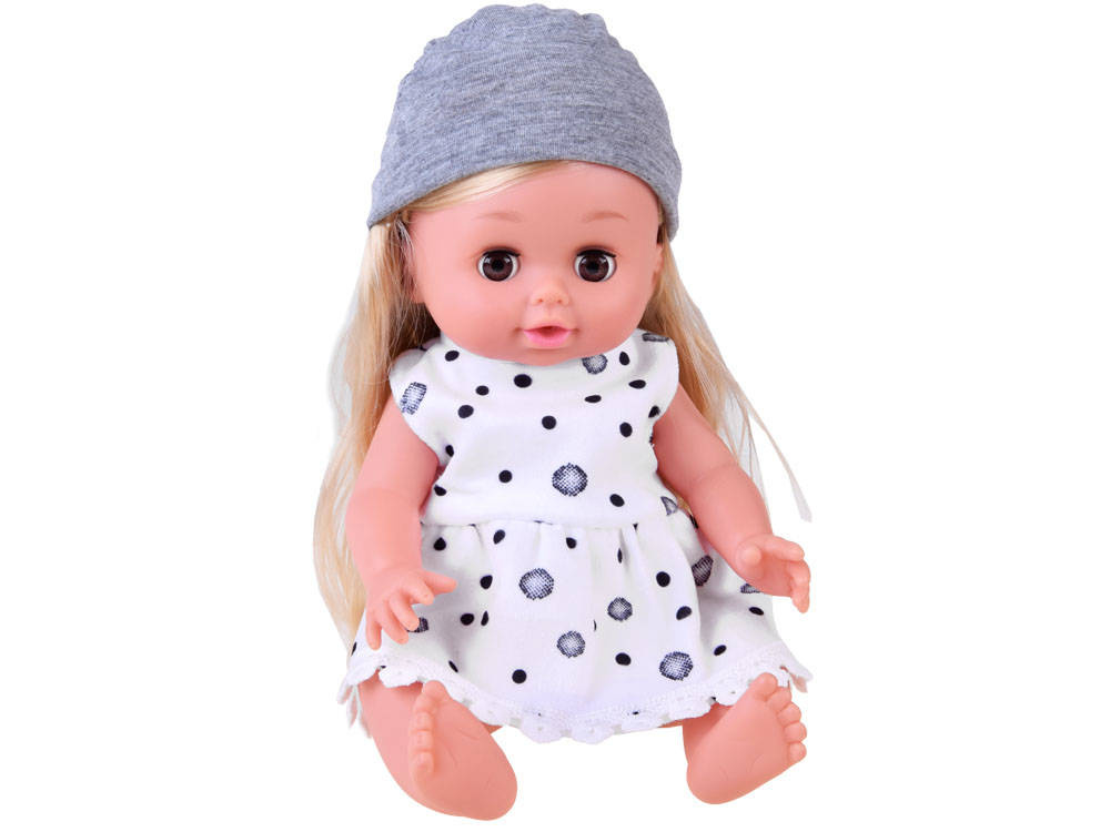 W zestawie znajduje się śliczna lala o brązowych oczach i długich blond włosach. Ubrana jest w uroczą, białą sukienkę w kropki. Całość stroju dopełnia szara, cienka czapeczka idealna na spacerki. Oczy lalki zamykają się, dzięki czemu może również spać. Tułów lalki wykonany jest z plastiku, a głowa, rączki i nóżki z gumy.