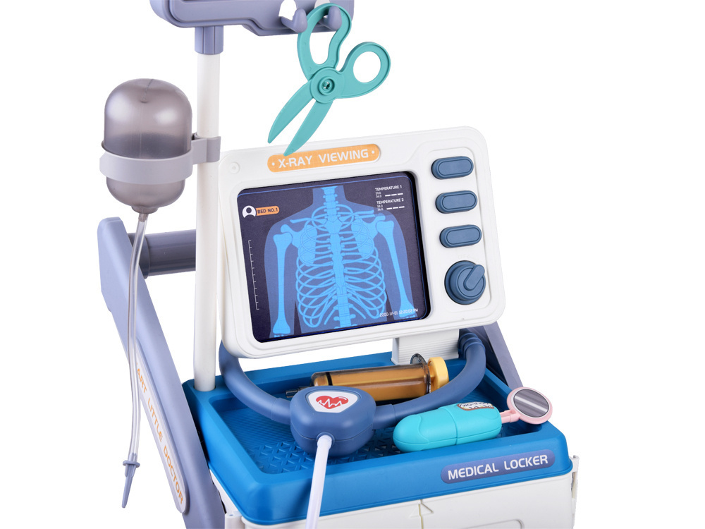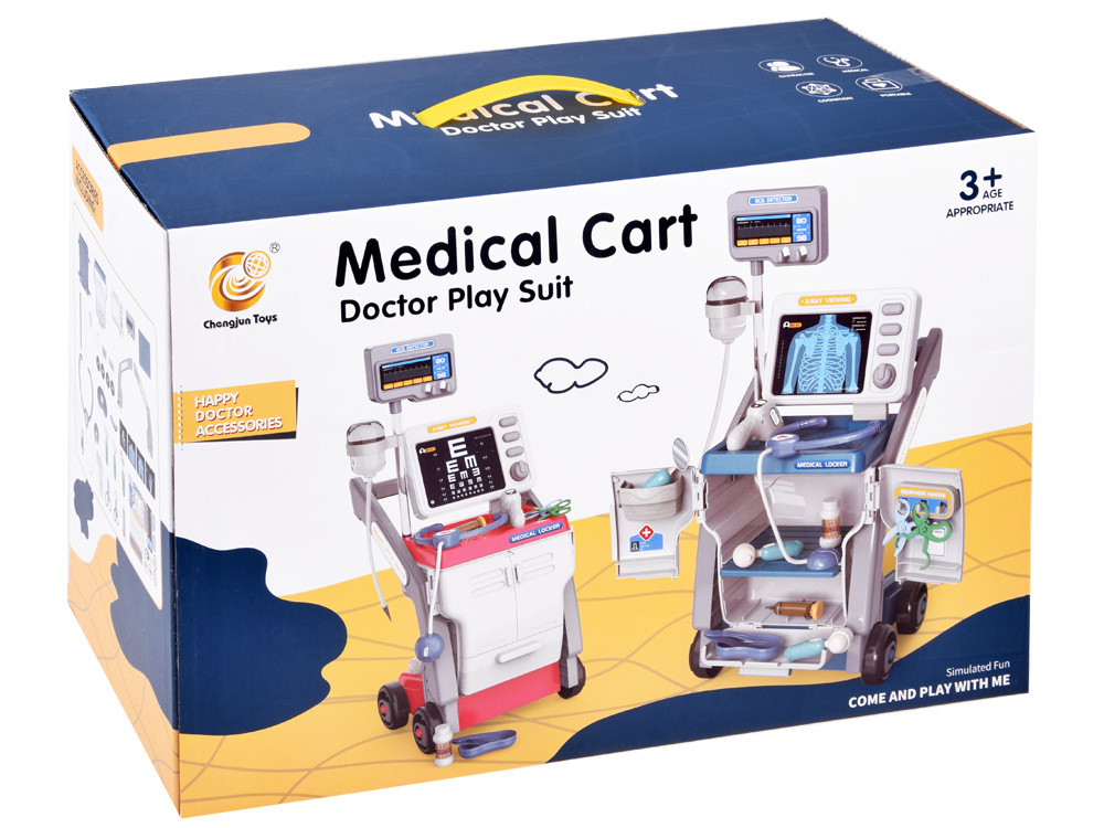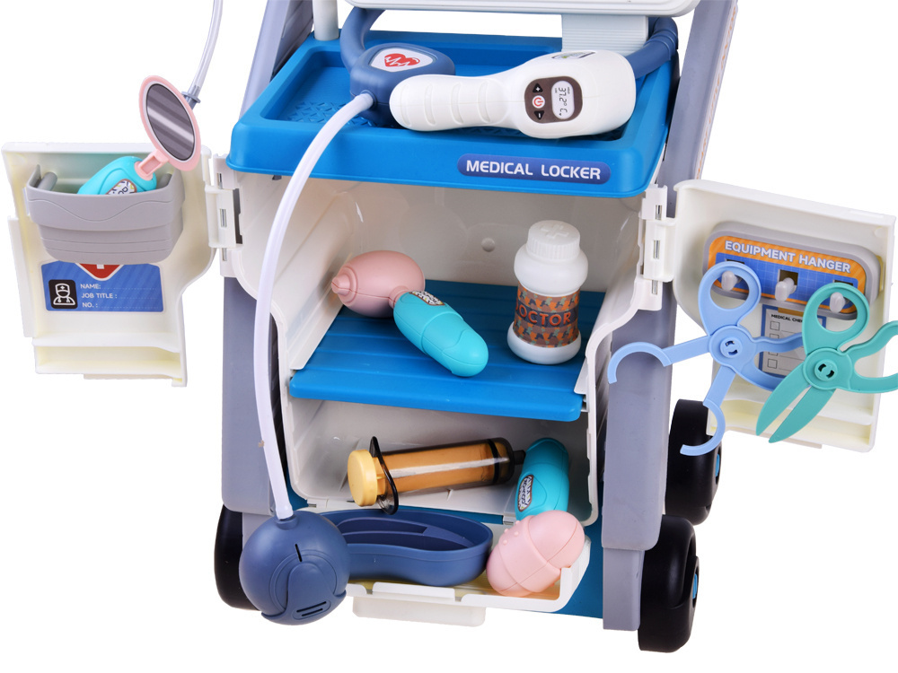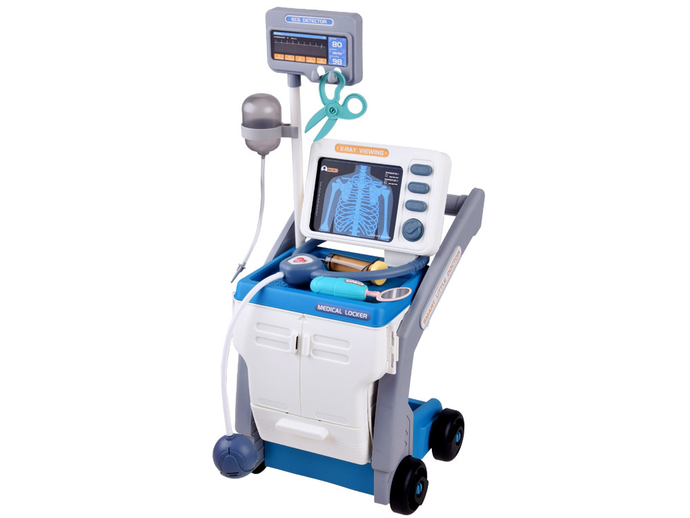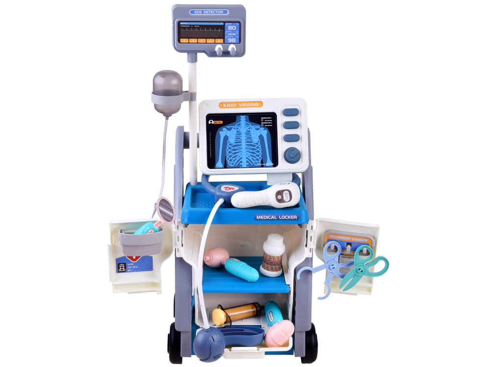 Wózek lekarski z akcesoriami dla małego lekarza. Świetny sprzęt dla dzieci do zabawy w doktora. Poręczny wózek zawiera wszystkie niezbędne akcesoria. Dzięki takiemu zestawowi wszystkie lalki, misie, inne zabawki, a zapewne także i rodzice czy dziadkowie będą zawsze zdrowi. Mały medyk zmierzy temperaturę, zrobi zastrzyk, podłączy kroplówkę, zbada serce i wzrok, zrobi prześwietlenie i co tylko jeszcze wymyśli.