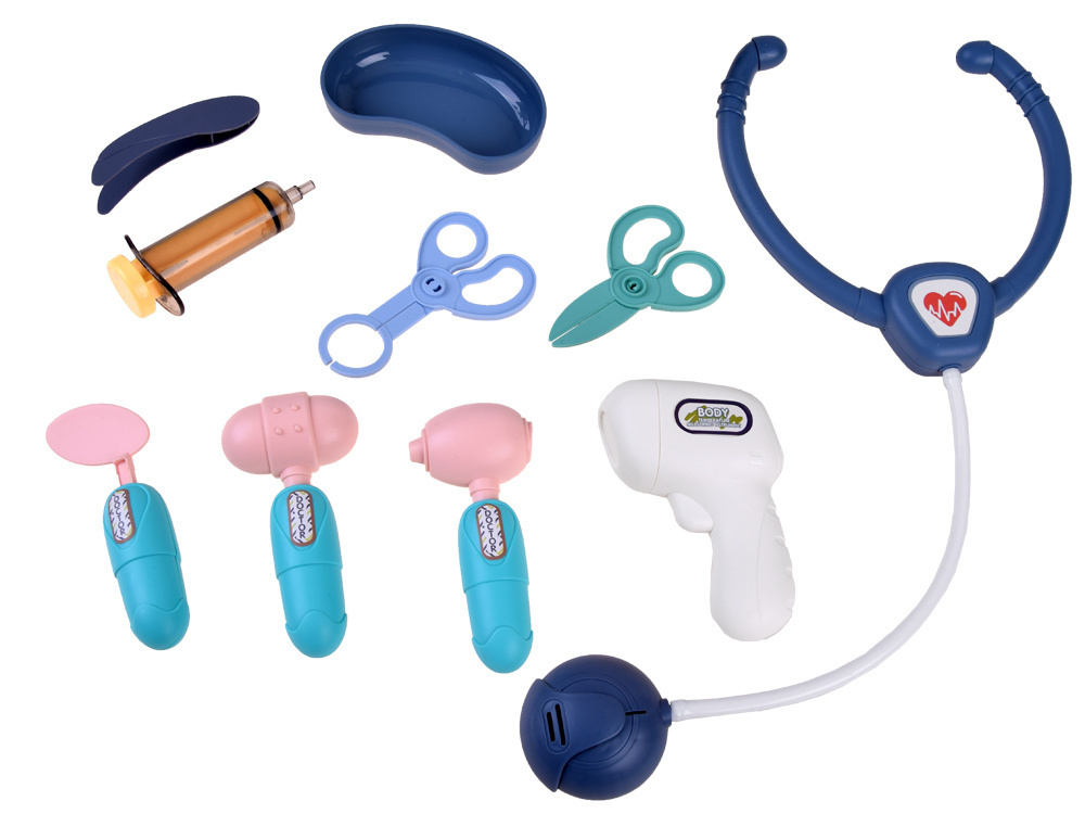 Plastikowy monitor posiada od góry szczelinę przez którą możemy wkładać karty np. z tablicą do badania wzroku lub prześwietlonymi częściami ciała, a po włożeniu baterii i przekręceniu pokrętła on/off wydaje odgłosy monitorowania paramentów życiowych pacjenta. Stetoskop dzięki zamontowanym już bateriom pozwoli na dokładne zbadanie serca pacjenta, po przyłożeniu słuchawki (naciskając przycisk od spodu) usłyszymy bicie jego serca. Zamykana szafka z wyciąganą półeczką pozwoli uporządkować sprzęt, i odłożyć wszystkie akcesoria które nie są potrzebne podczas badania.