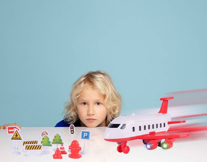 Zabawę urozmaicają efekty dźwiękowe, które aktywujemy poprzez 4 przyciski umieszczone na czubku samolotu. W zestawie znajdziemy również liczne akcesoria, takie jak znaki, drzewa, pachołki drogowe i wiele innych.