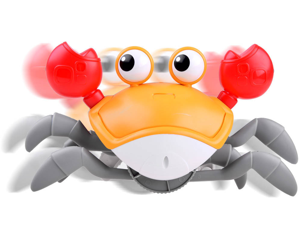 Uciekający Krab to idealna zabawka dla każdego smyka, który już zaczyna przygodę z chodzeniem. Krab w całości wykonany został z tworzywa sztucznego w efektownych kolorach. Posiada sześć odnóży, którymi zgrabnie porusza się na boki, w momencie gdy napotka przeszkodę wybiera inny kierunek. W trakcie spaceru krab wygrywa delikatnie wesołe melodie.