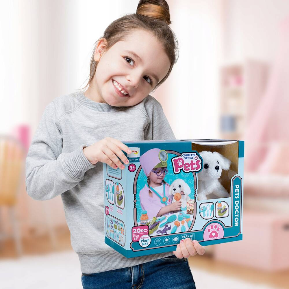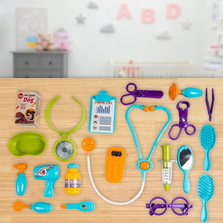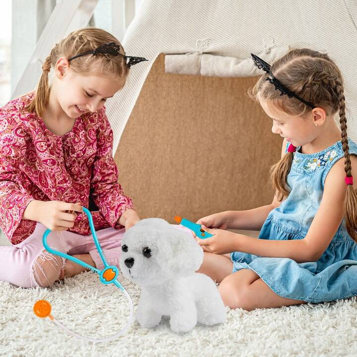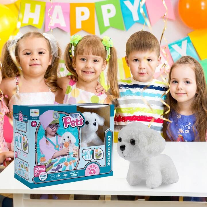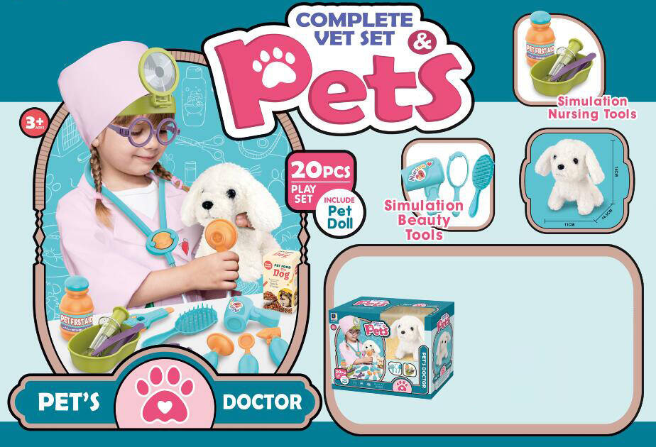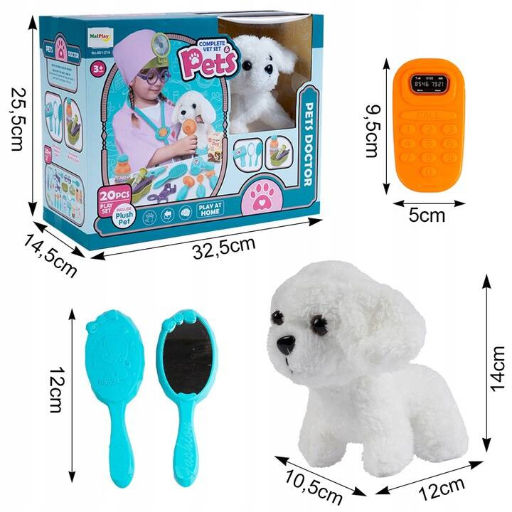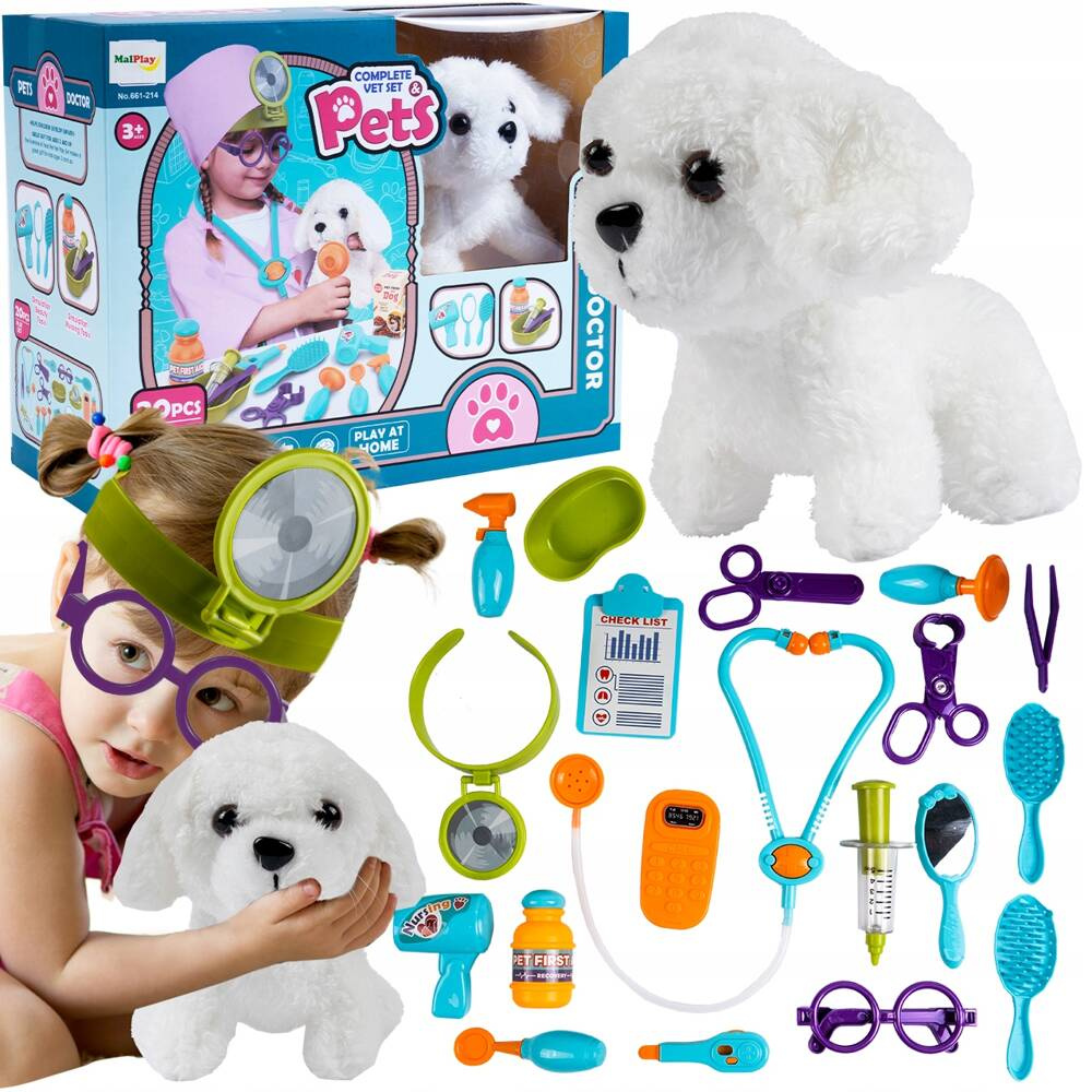 Zestaw zawiera pluszowego pieska, którego dziecko może badać, leczyć i opiekować się nim. Wyposażenie medyczne Zabawka "mały weterynarz" posiada również podstawowe wyposażenie medyczne. Dzięki temu dziecko może udawać, że wykonuje badania i procedury medyczne na pluszowym pacjencie.