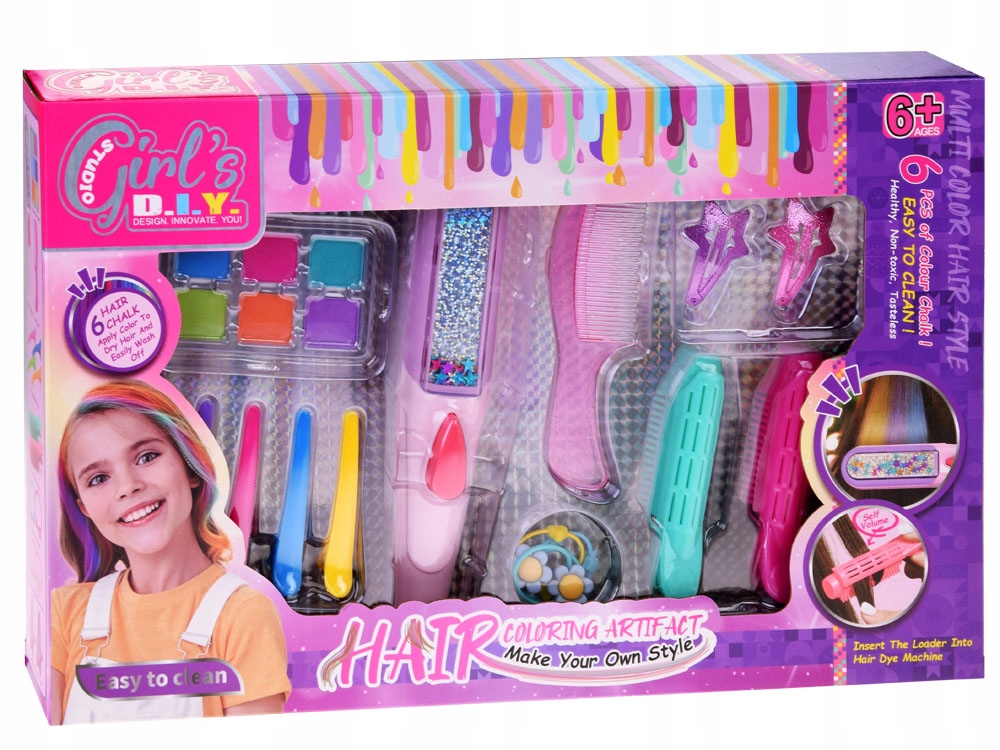 Zestaw zawiera wszystkie niezbędne akcesoria dzięki którym można stworzyć nową kolorową fryzurę. Znajdziemy tutaj aż 6 kolorów kredy: fioletowy, pomarańczowy, zielony, morski, różowy, niebieski; a także klipsy, grzebyk i wałki ułatwiające tworzenie stylowej fryzury. Kolorowe spinki oraz gumki do włosów upiększą stylizację.