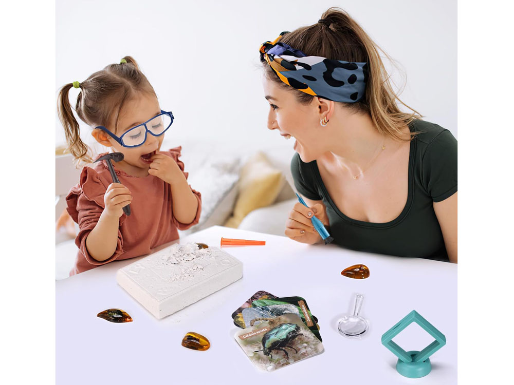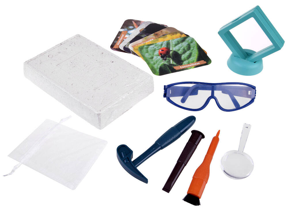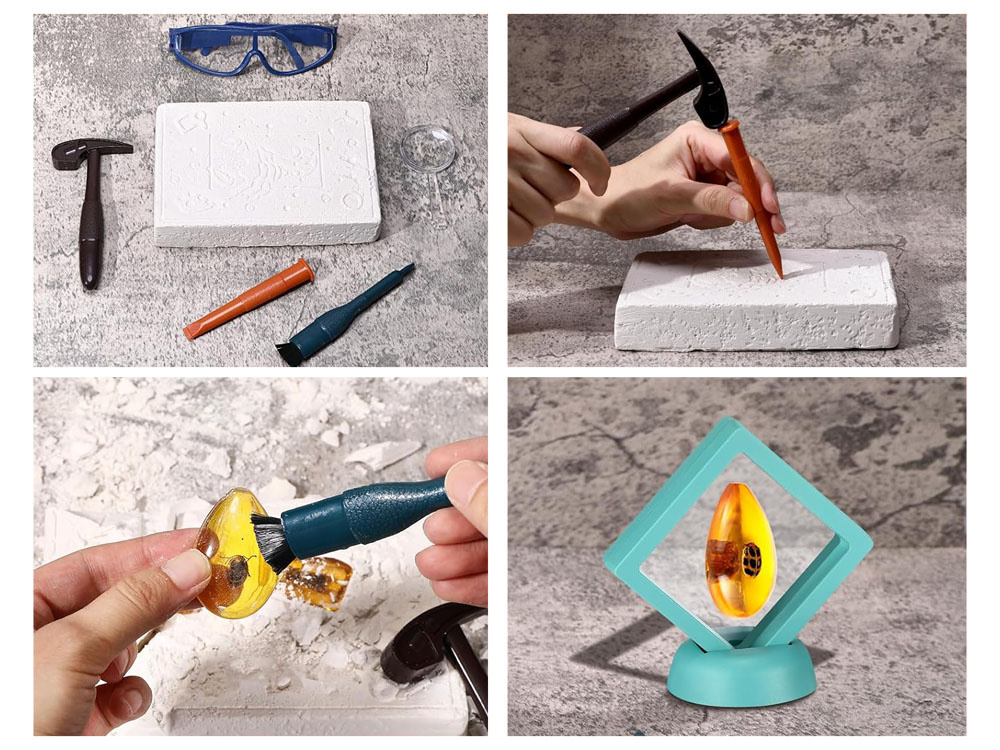 W gipsowym odlewie zostało ukrytych sześć bursztynów z zatopionymi owadami. Naszym zadaniem jest wykopanie ich za pomocą dołączonych przyrządów- młoteczka i dłuta.