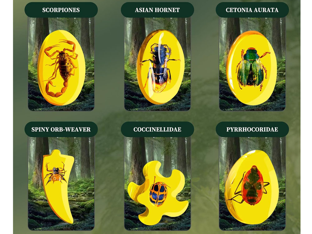 - 6 kart z wizerunkami i opisami owadów w języku angielskim.