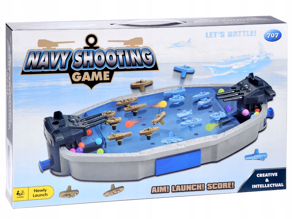 W opakowaniu znajdziemy: planszę, dwie wieże strzelnicze, statki w dwóch kolorach: niebieskim i brązowym oraz kolorowe kulki do strzelania. Dzięki zabudowanej planszy kolorowe kulki, nie pogubią się. Zabawka wykonana została w całości z plastiku, z dbałością o każdy szczegół, dzięki czemu wygląda naprawdę fantastycznie.