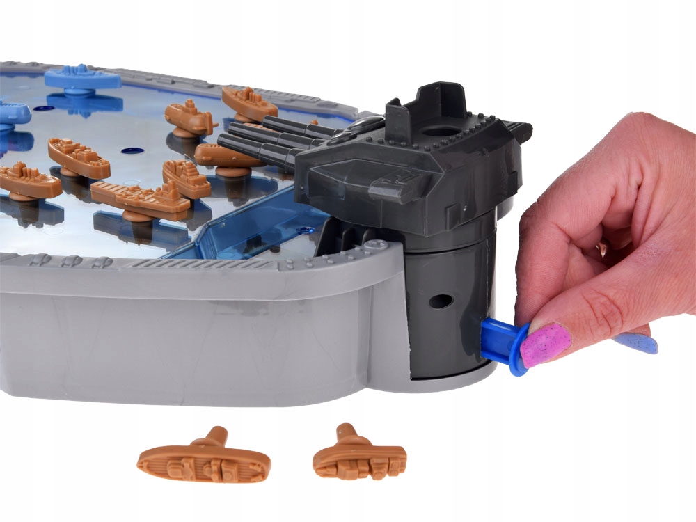 Gra Statki bitwa morska to fajna propozycja dla dzieci lubiących gry zręcznościowe. Z taką grą możemy stoczyć zaciętą bitwę morską nie wychodząc z domu. Wystarczy zamontować wieże strzelnicze, wybrać kolor naszych statków (każdy gracz ma ich 10), rozmieścić je odpowiednio na planszy i podzielić po równo kolorową amunicję. Kulki wrzucamy do wieży strzelniczej i 3,2,1 start zaczynamy zabawę! Aby strzelać naciskamy niebieski przycisk umieszczony pod wieżą. Kulki wylatują jak z procy i starają się wybić statek przeciwnika. Wybite statki odkładamy na bok, a po zakończeniu wojny liczymy straty. Wygrywa ten, kto zniszczył więcej statków przeciwnika, a sam stracił ich jak najmniej i tym samym zachował przewagę na polu bitwy.