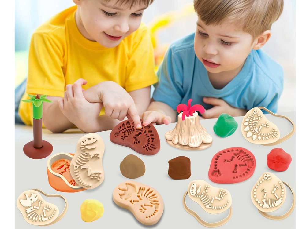 Zestaw pozwoli wkroczyć w świat archeologów badających prehistoryczny świat dinozaurów. Wystarczy, że ciastolinę rozwałkujesz na cieńszy plaster i przyłożysz formę z wybranym wzorem skamielin dinozaurów.