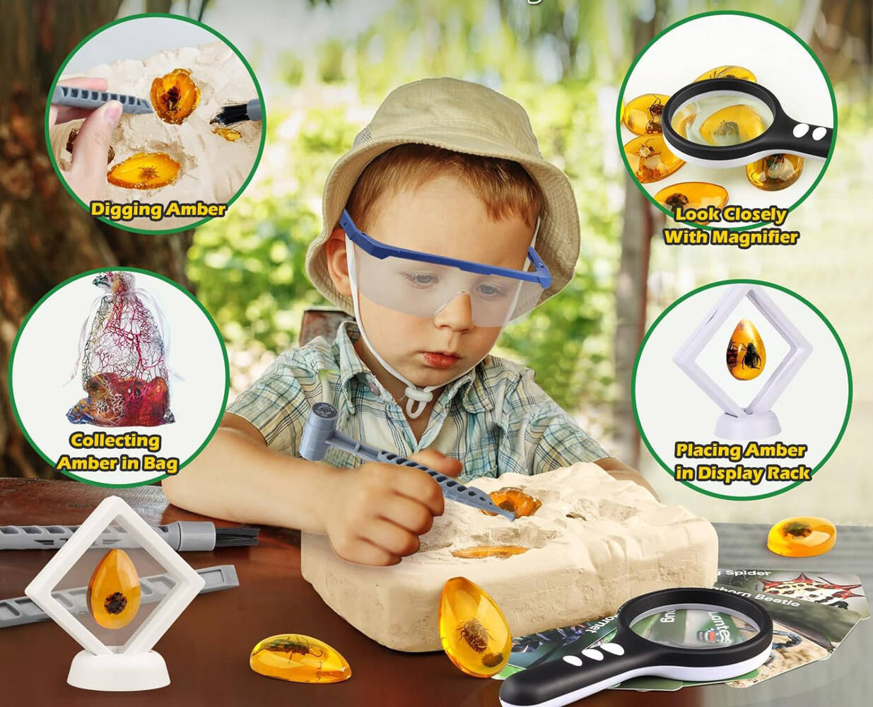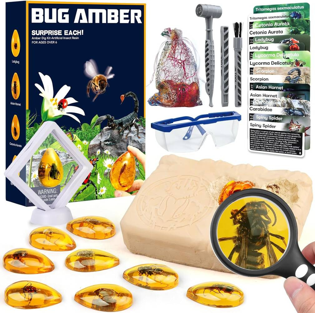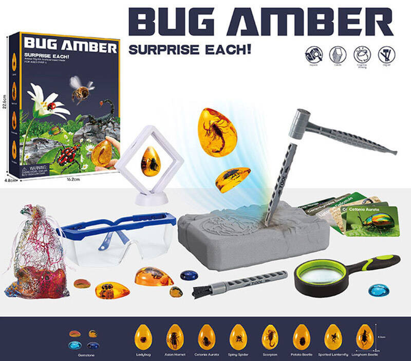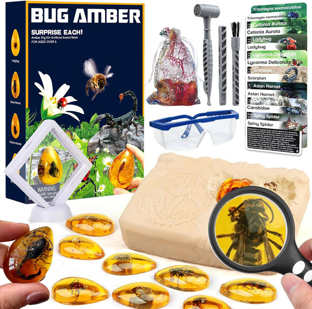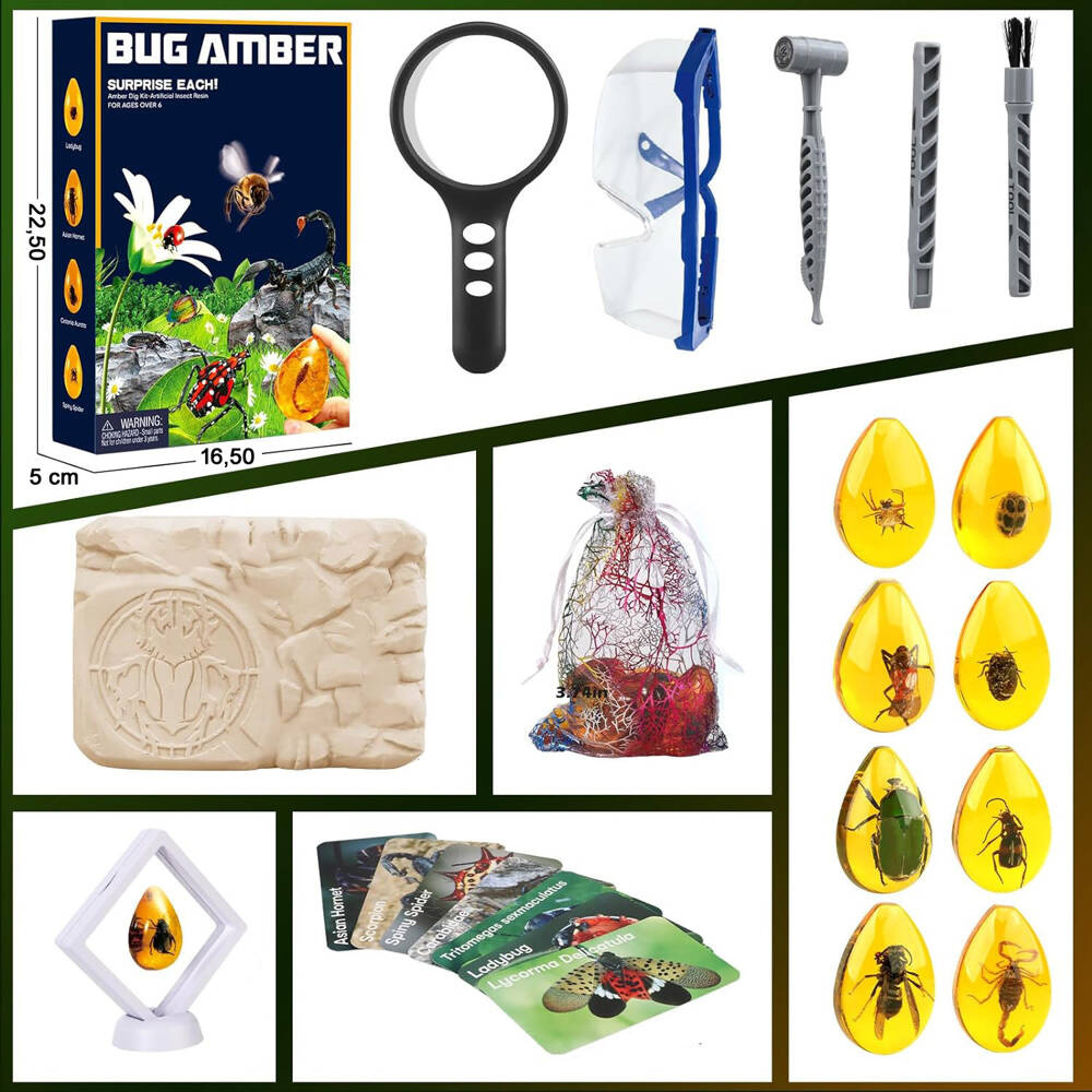 • Autentyczność: Zestaw zawiera kawałki bursztynu z zamrożonymi w nim skamielinami owadów, co zapewnia autentyczne doświadczenie archeologiczne.
