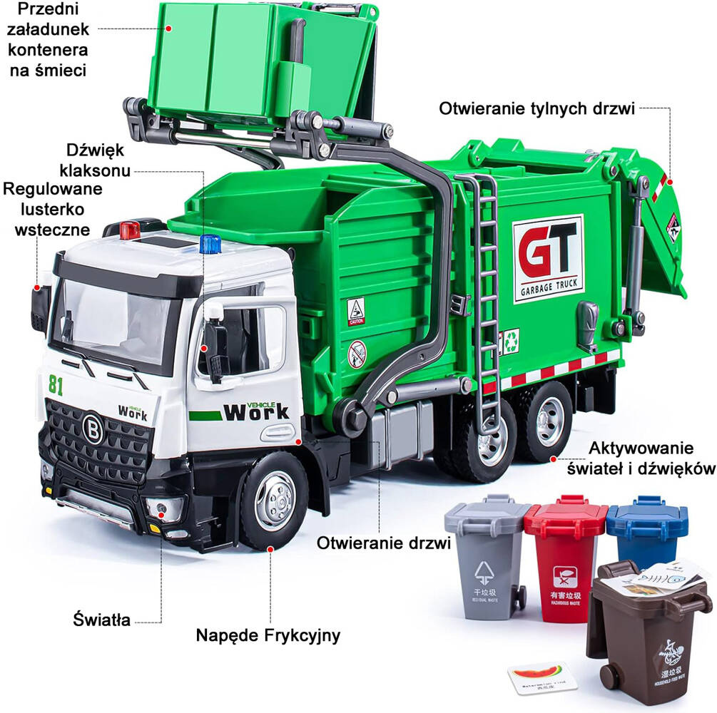 - AUTO Śmieciarka metalowa z napędem Zabawka kosze segregacja śmieci dla dzieci. ŚMIECIARA ŚWIATŁO DŹWIĘK
