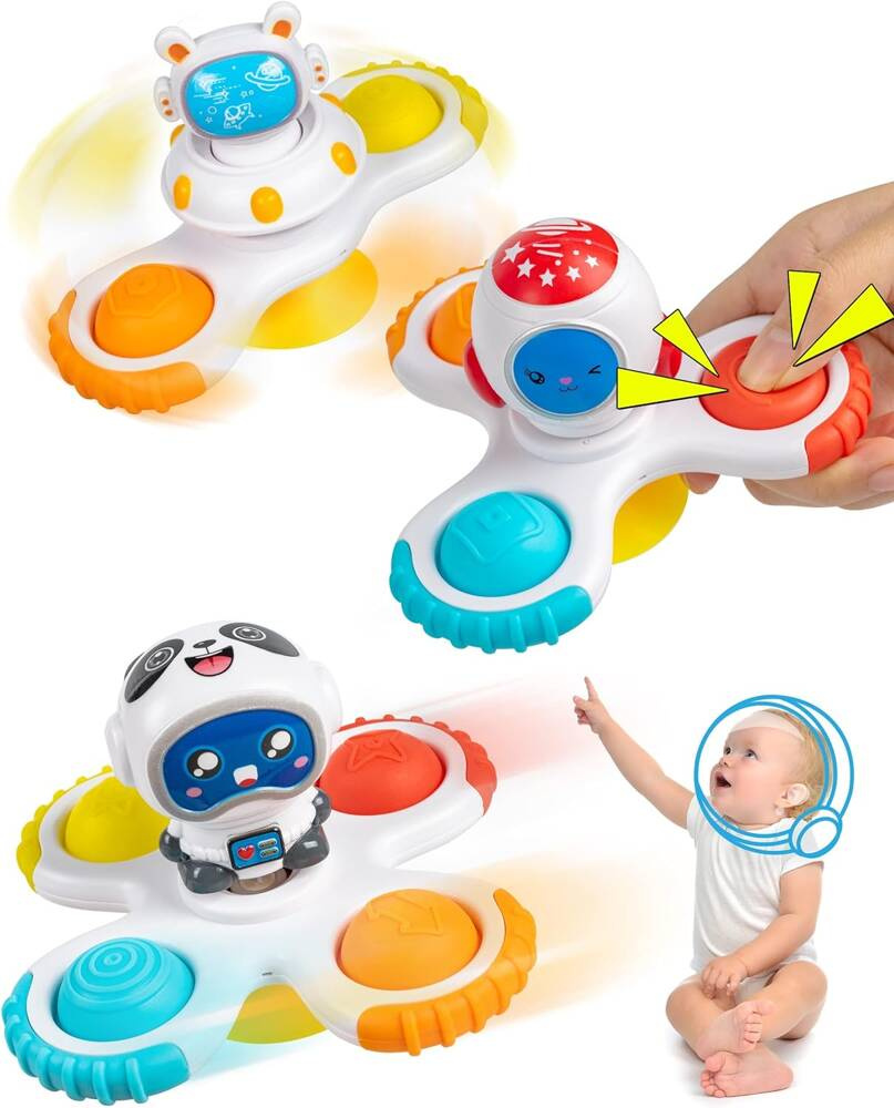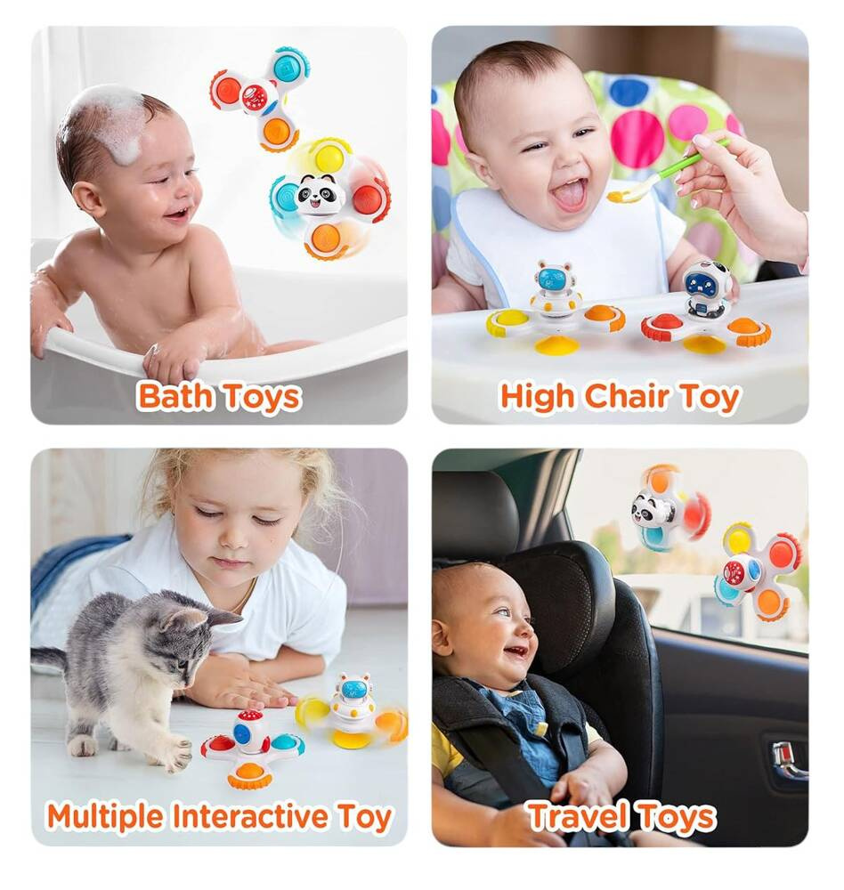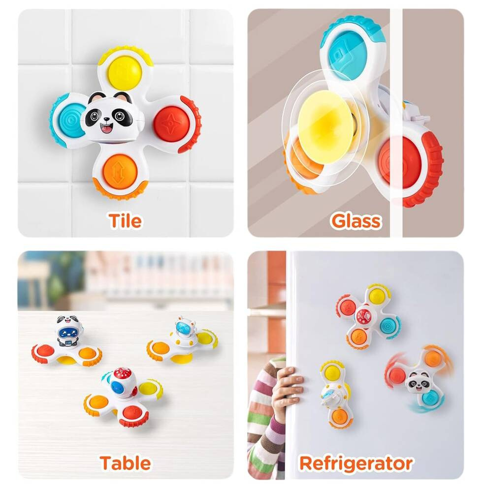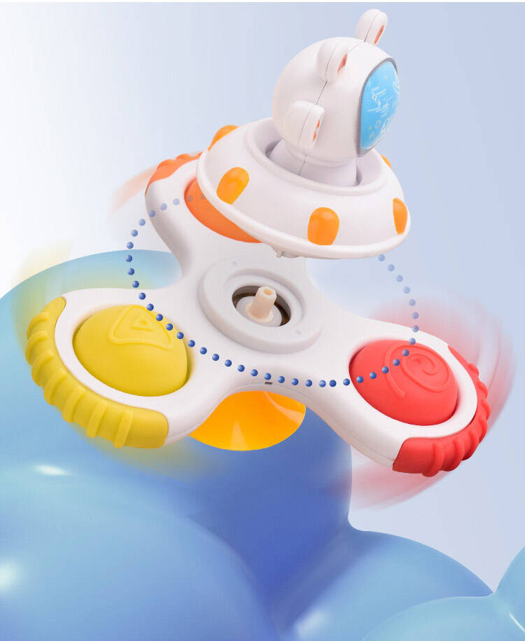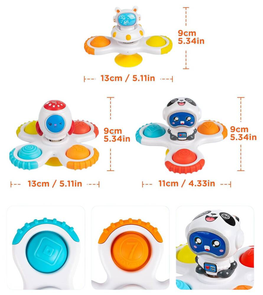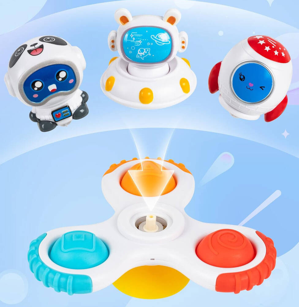 - ASTRONAUTA WIRUJĄCE SPINNERY GRZECHOTKI GRYZAKI Z PRZYSSAWKAMI to zestaw 3 zabawek sensorycznych, które dzięki przyssawkom mogą być przymocowane do różnych powierzchni, takich jak wanny, okna, krzesełka do karmienia czy nawet podczas podróży samolotem, samochodem lub wózkiem.