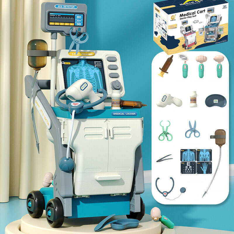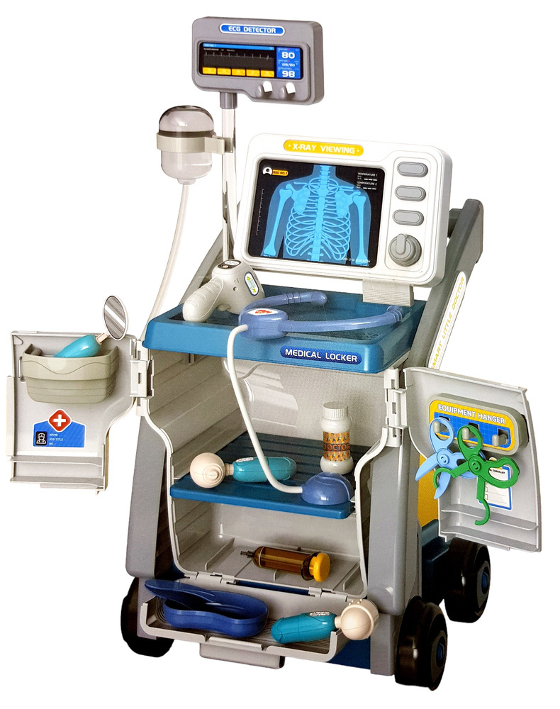 Zestaw zawiera pełen wachlarz medycznych akcesoriów, dzięki którym dzieci mogą symulować różne scenariusze medyczne. Na wyposażeniu znajduje się m.in. stetoskop, ciśnieniomierz, urządzenie EKG. Wszystkie te elementy są umieszczone na wygodnym wózku, co ułatwia ich transportowanie oraz organizację.