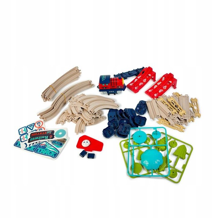 • 75 elementów torów i akcesoriów – zestaw zawiera szyny, łączniki, łuki, mosty, elementy podniesione, pętlę.