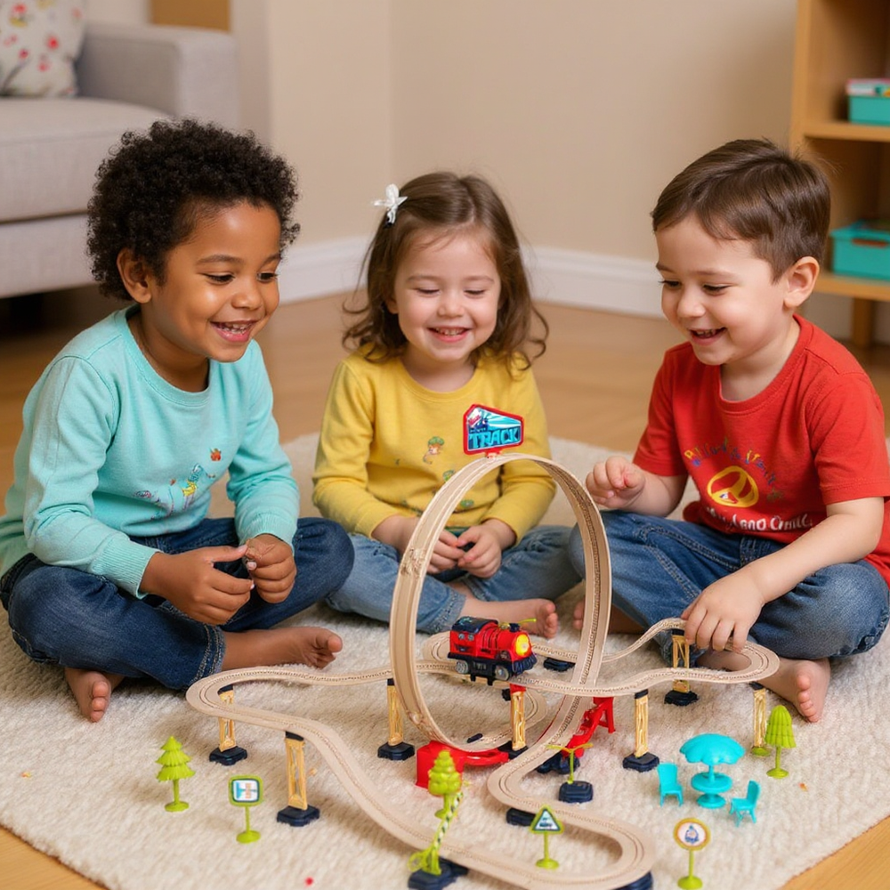 • Możliwość budowania pętli i akrobacji – trasa może zawierać pętlę, dzięki której pociąg przejeżdża „do góry nogami”.