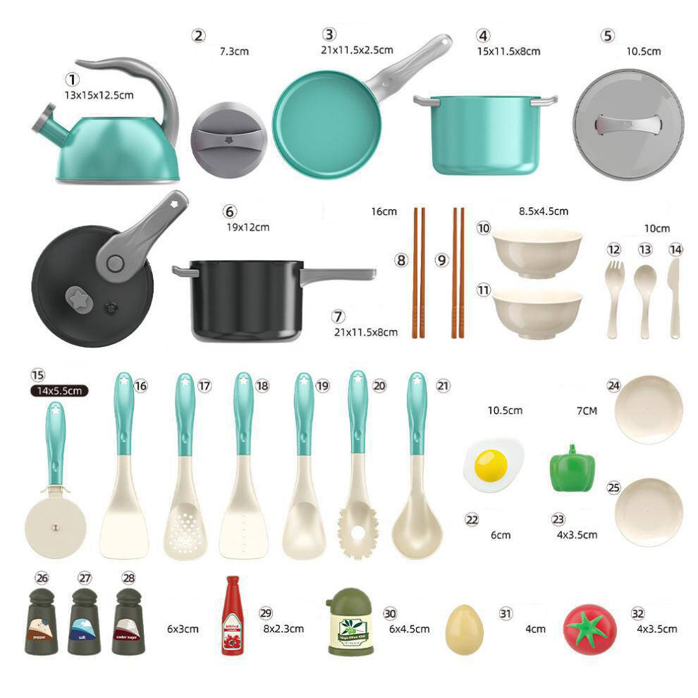 1. Bogaty zestaw 32 elementów: W skład zestawu wchodzą garnki, naczynia i różnorodne akcesoria, które zapewniają wiele możliwości zabawy i nauki.