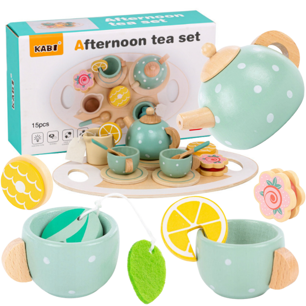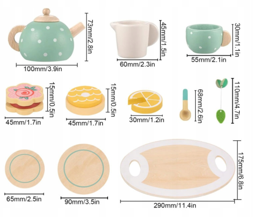 DREWNIANY ZESTAW HERBACIANY DLA DZIECI ZASTAWA DZBANEK TALERZYKI TACA 15 EL