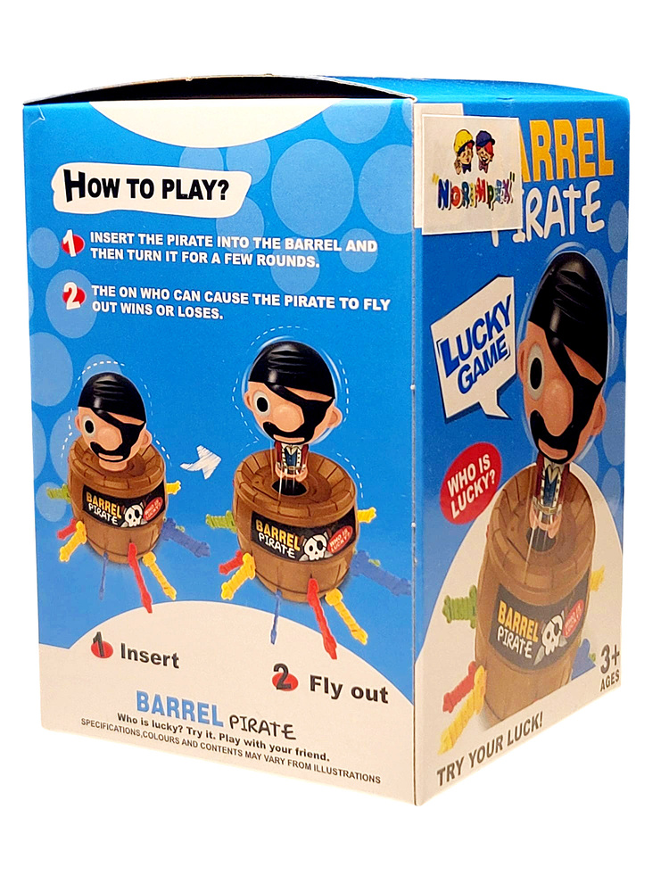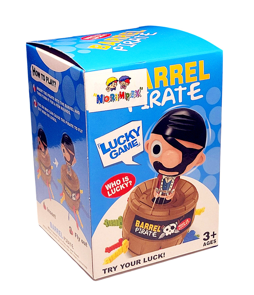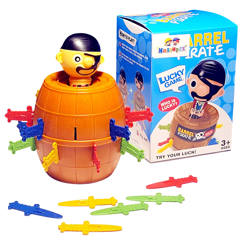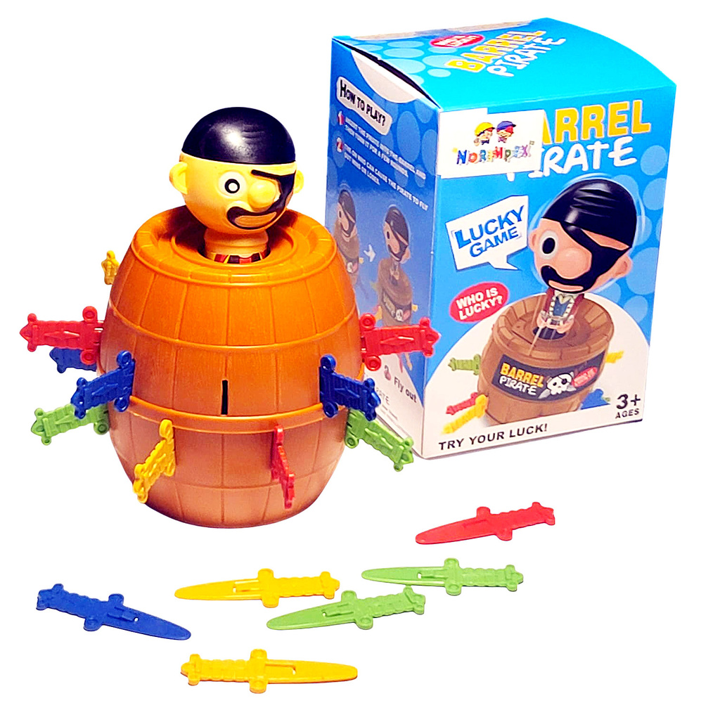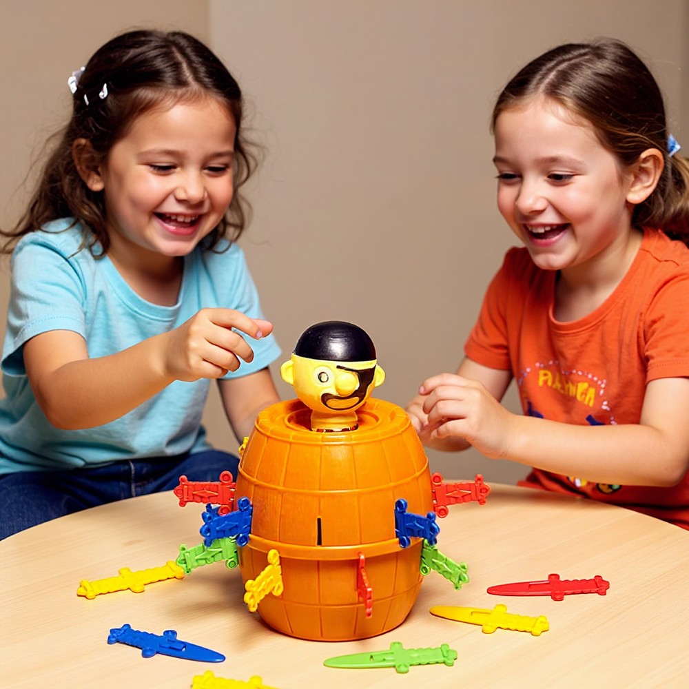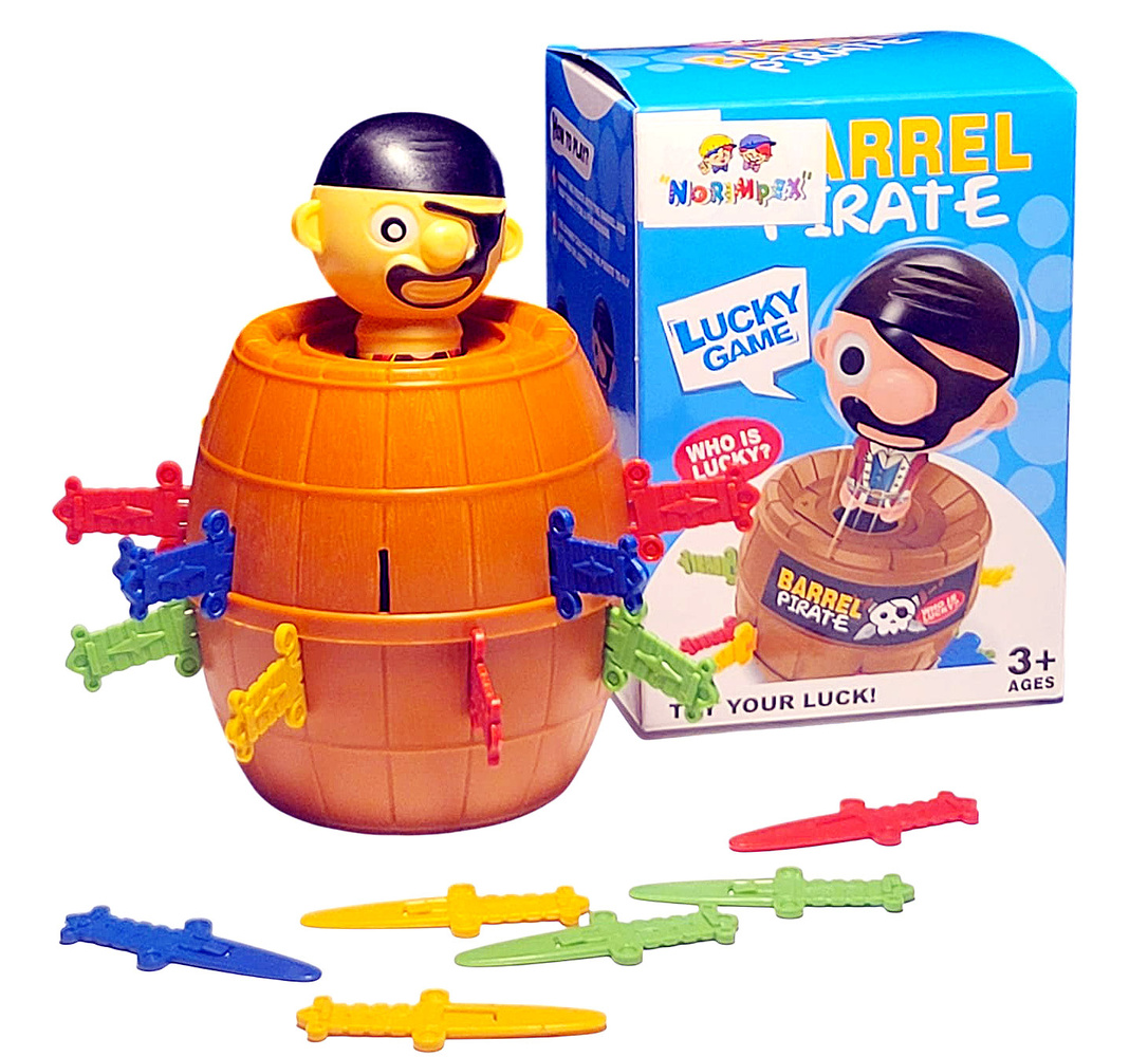 Piracka Beczka z Mieczami to gra zręcznościowa, w której gracze na zmianę wbijają plastikowe miecze w specjalne otwory w beczce. Nie wiedzą, który miecz uruchomi mechanizm, który wyrzuci (lub wysadzi) pirata w powietrze. Każdy wbity miecz to potencjalna emocjonująca chwila — kto zaskoczy, kto uniknie pułapki?