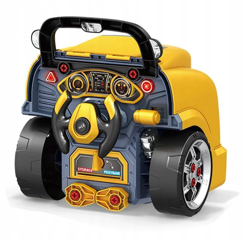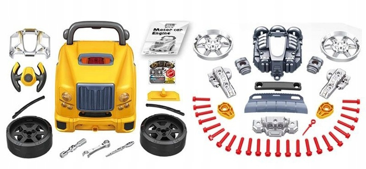 W komplecie znajdują się: śrubki, śrubokręty, klucze, elementy silnika – wszystko, co potrzebne, aby dziecko mogło samodzielnie złożyć mechanizm jak mały majsterkowicz.