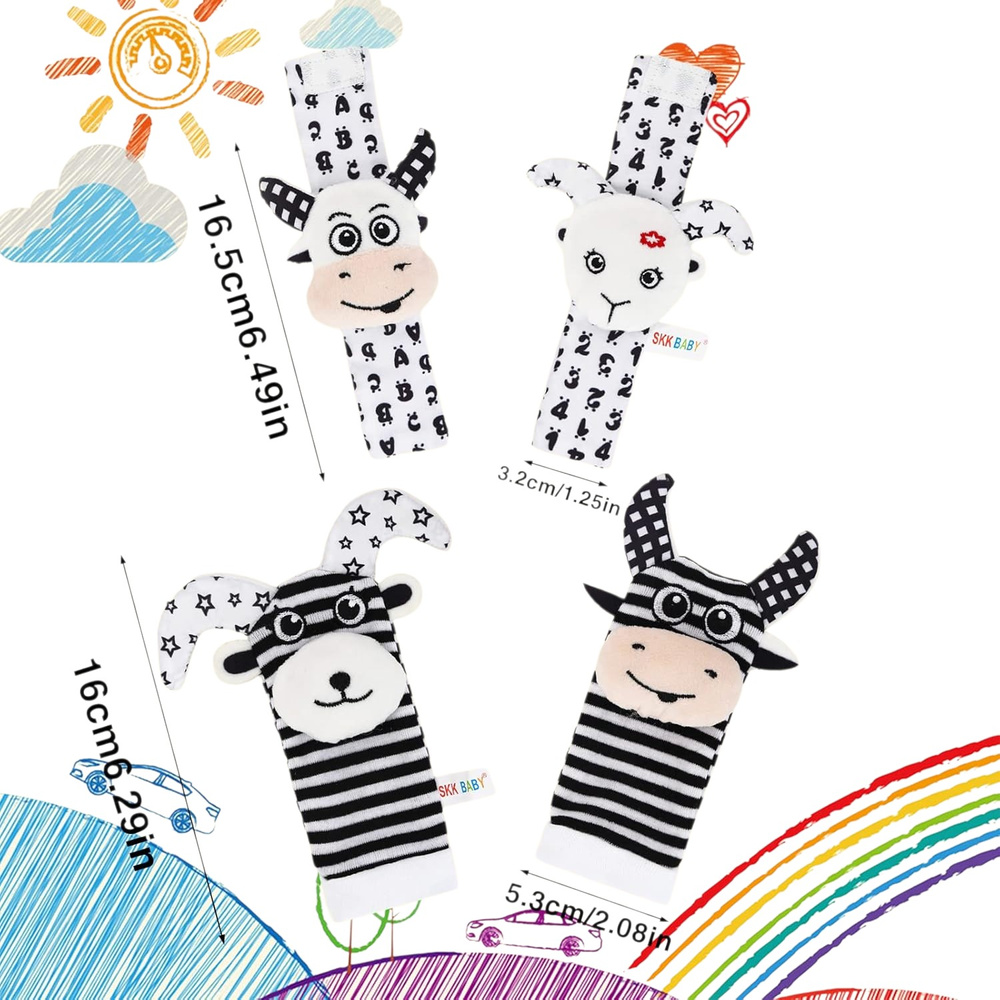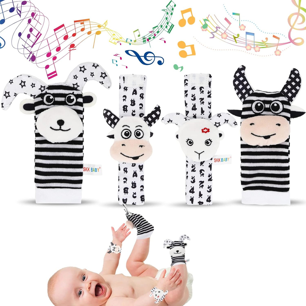 Zestaw grzechotek dla niemowląt – 4 sztuki: opaski na rączki i skarpetki z dźwiękiem. Edukacyjna zabawka sensoryczna wspomagająca rozwój dziecka. Idealny prezent!