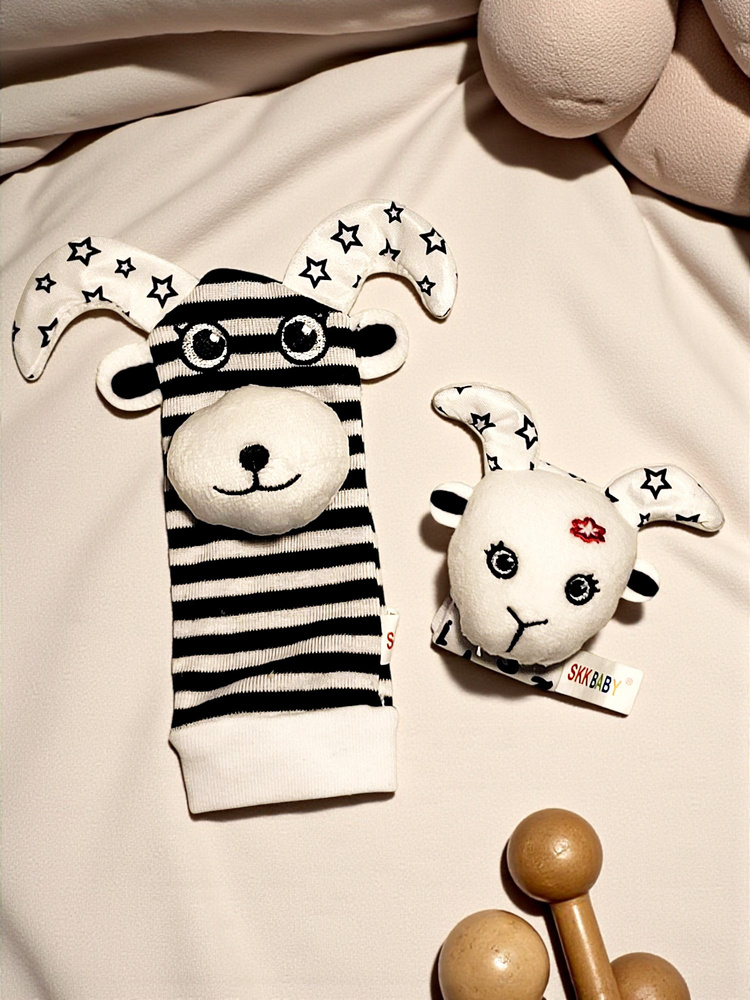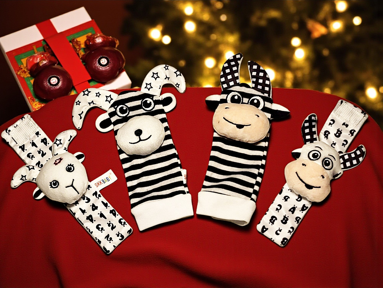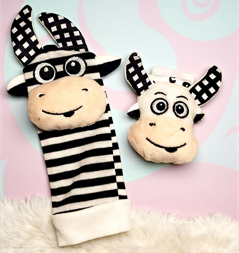 Dwie skarpetki z grzechotkami – każda skarpetka zawiera pluszową główkę zwierzątka i ukrytą wewnątrz grzechotkę. Skarpetki są elastyczne, dobrze dopasowane i wygodne.