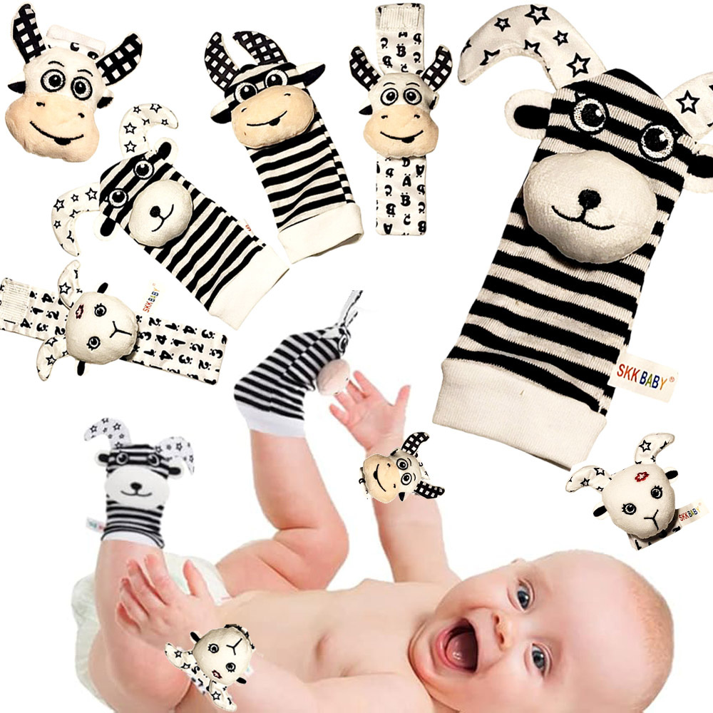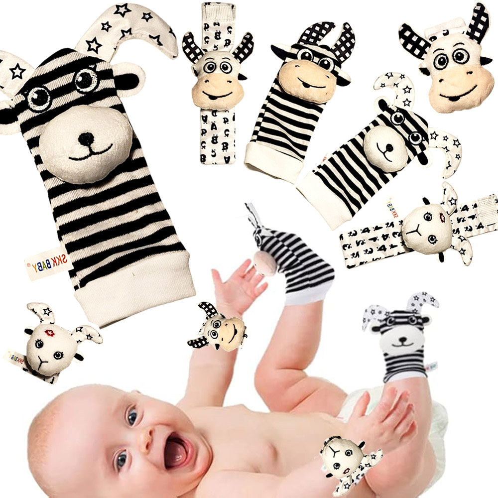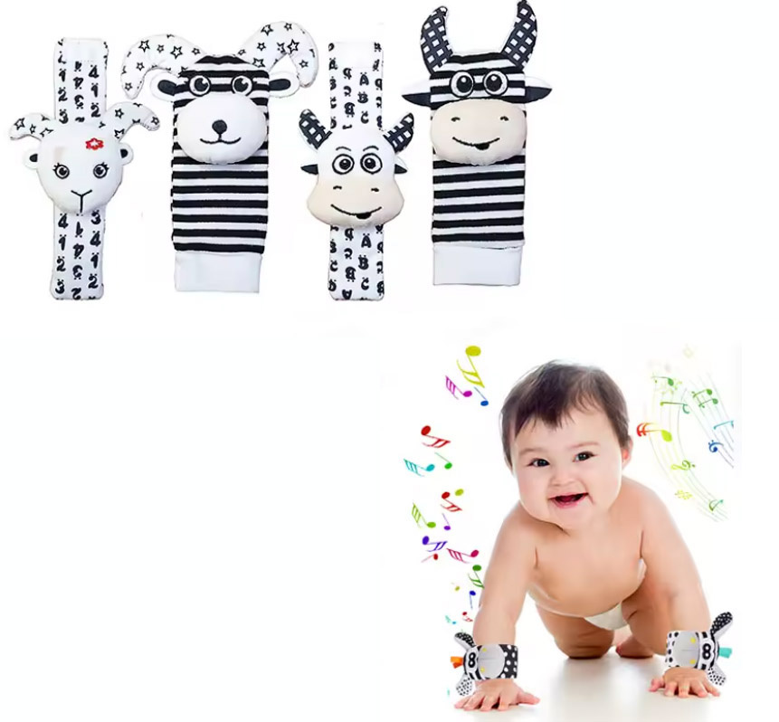 - Grzechotki dla niemowląt – zestaw 4 szt. = 2x opaski na rączki i 2x skarpetki z dźwiękiem