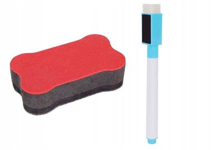- zestaw 5 kolorowych kred do pisania, gąbkę z magnesem do czyszczenia, pisak suchościeralny.