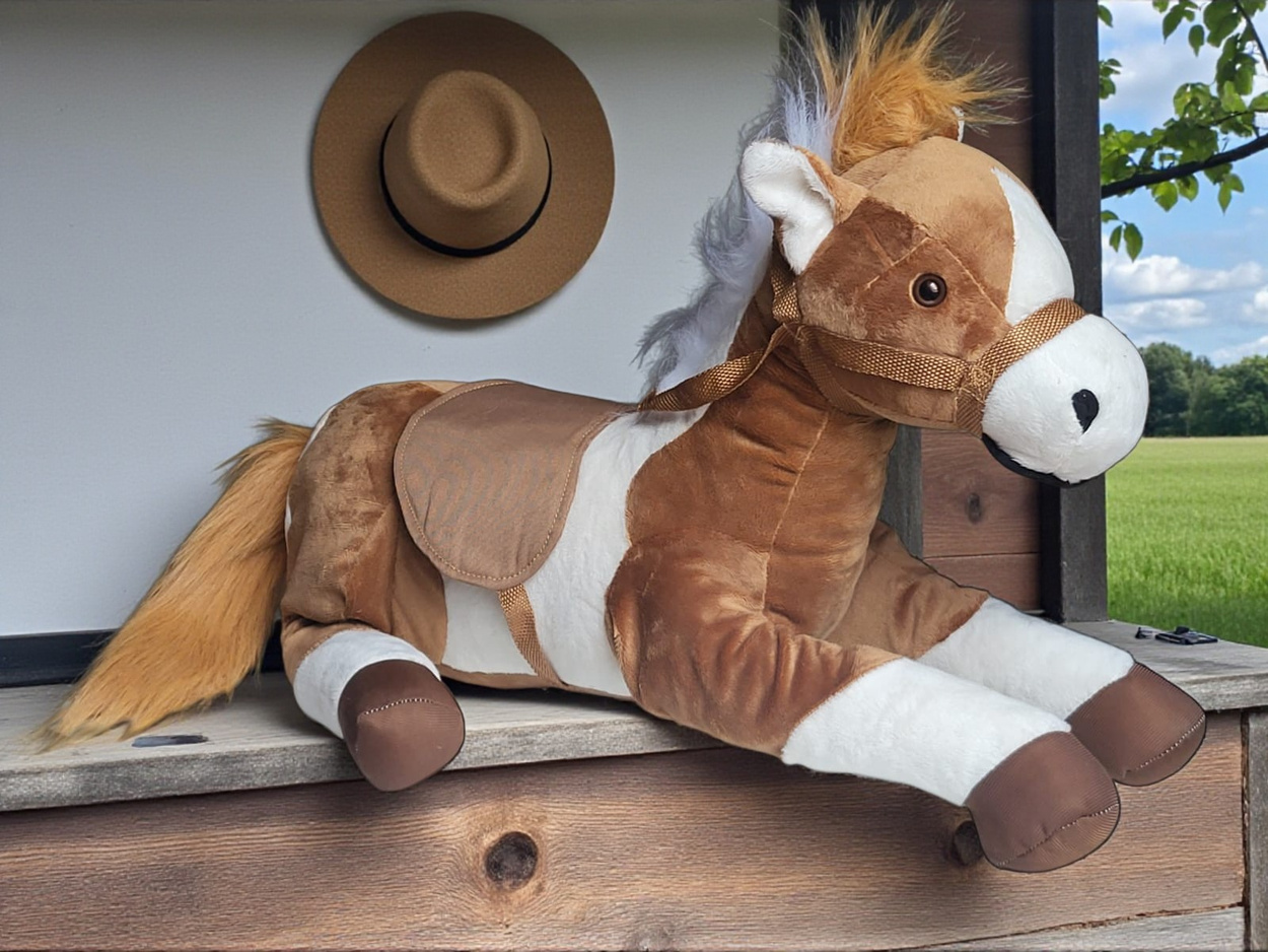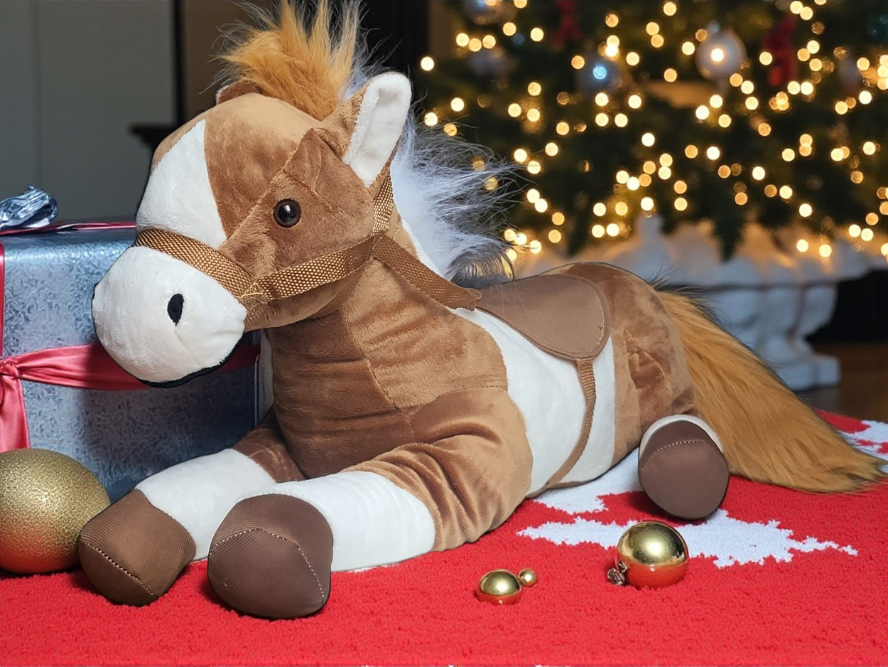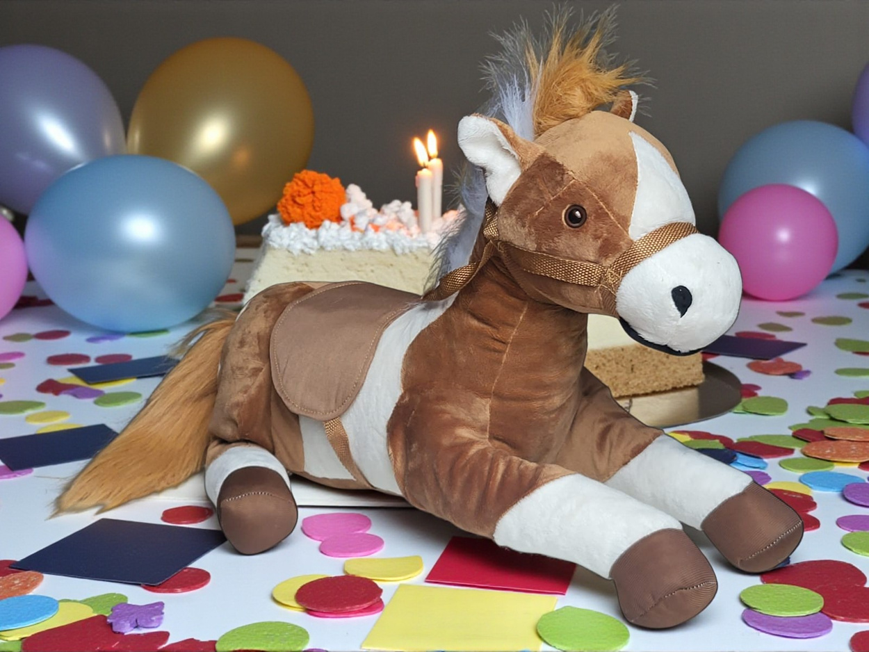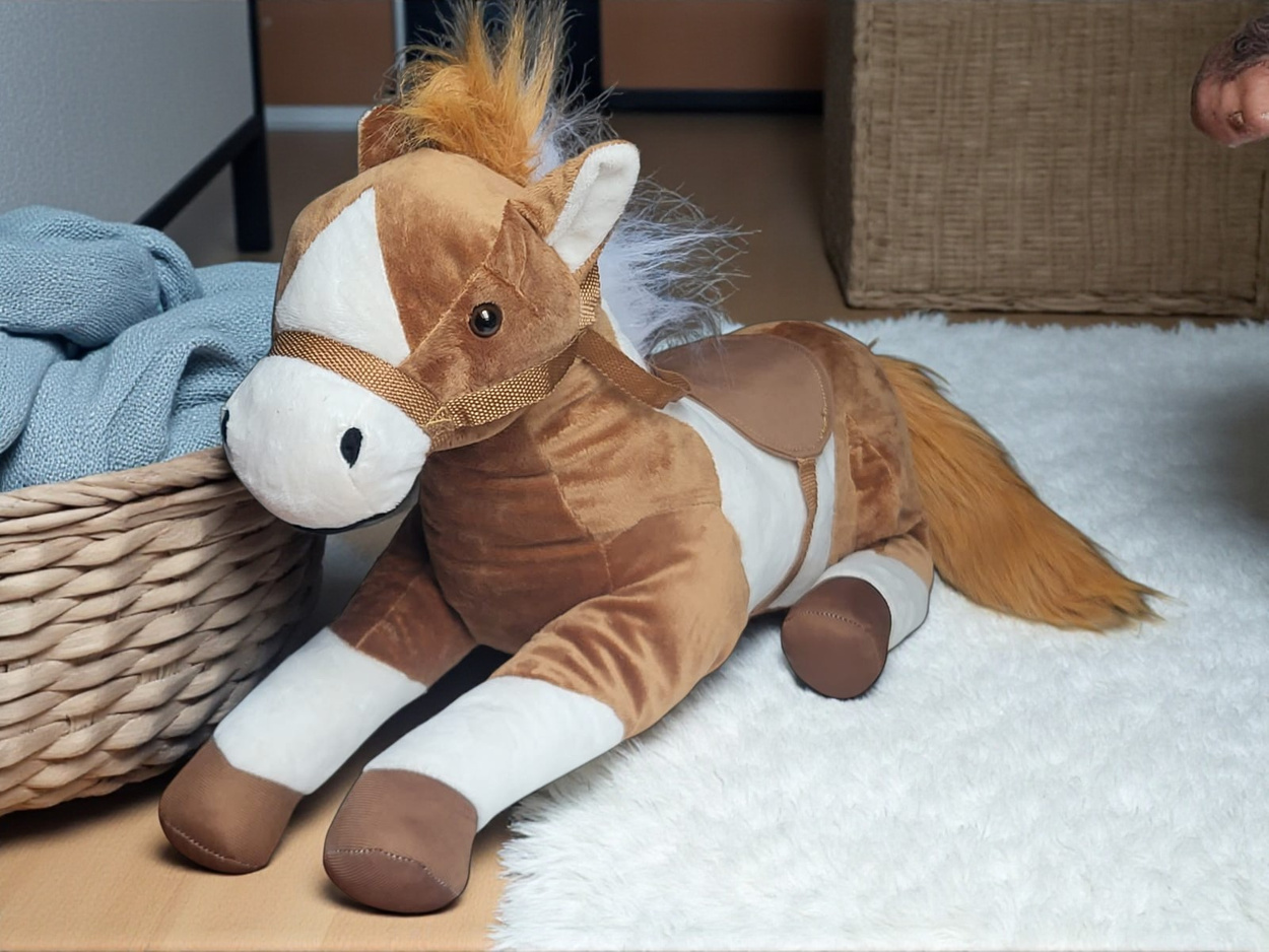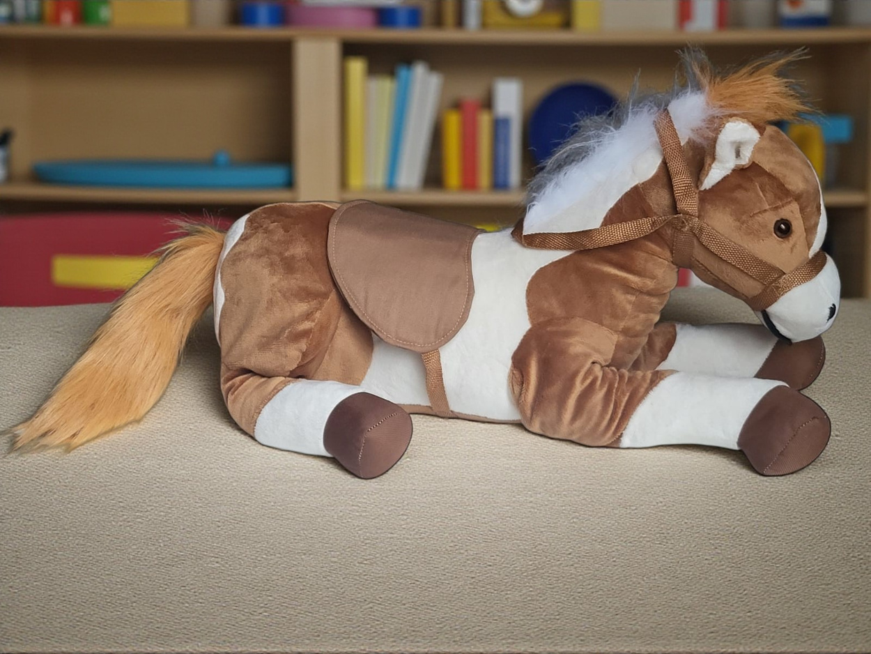 - Urocza maskotka konika brązowo-białego, długość 50 cm, leżąca pozycja, miękki plusz – idealna przytulanka i dekoracja pokoju dziecięcego. Bezpieczny materiał, certyfikaty CE.