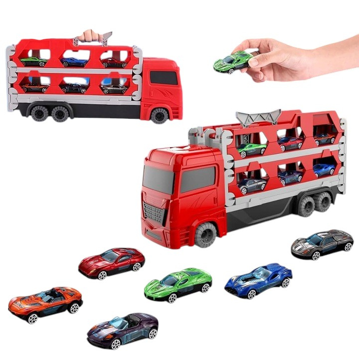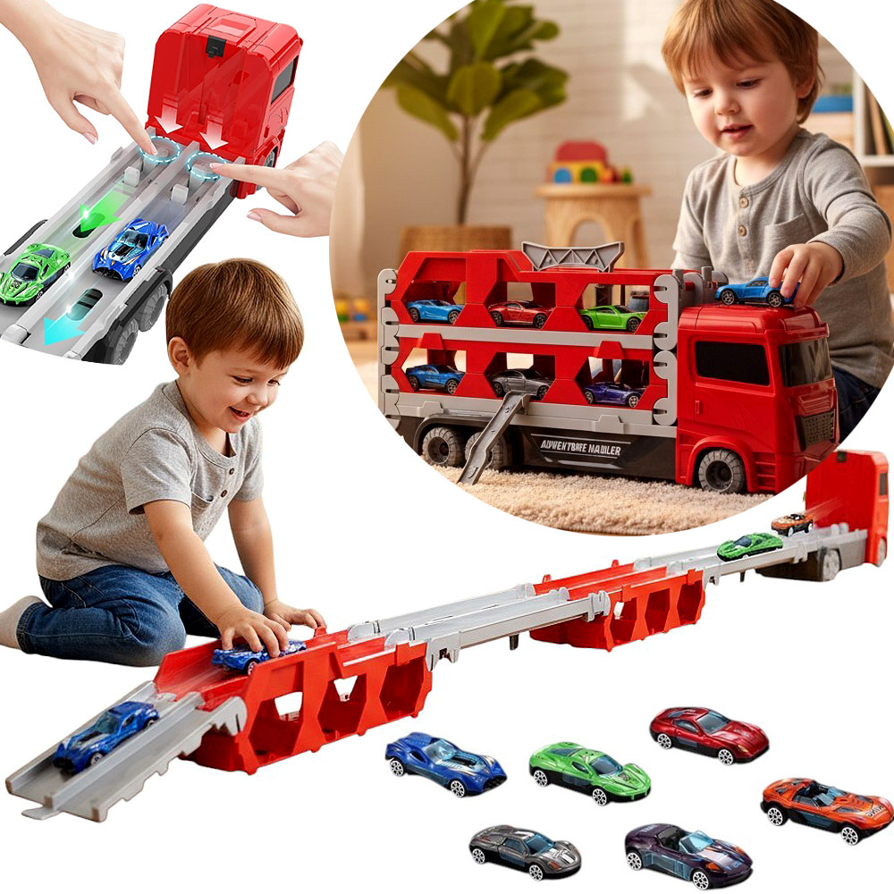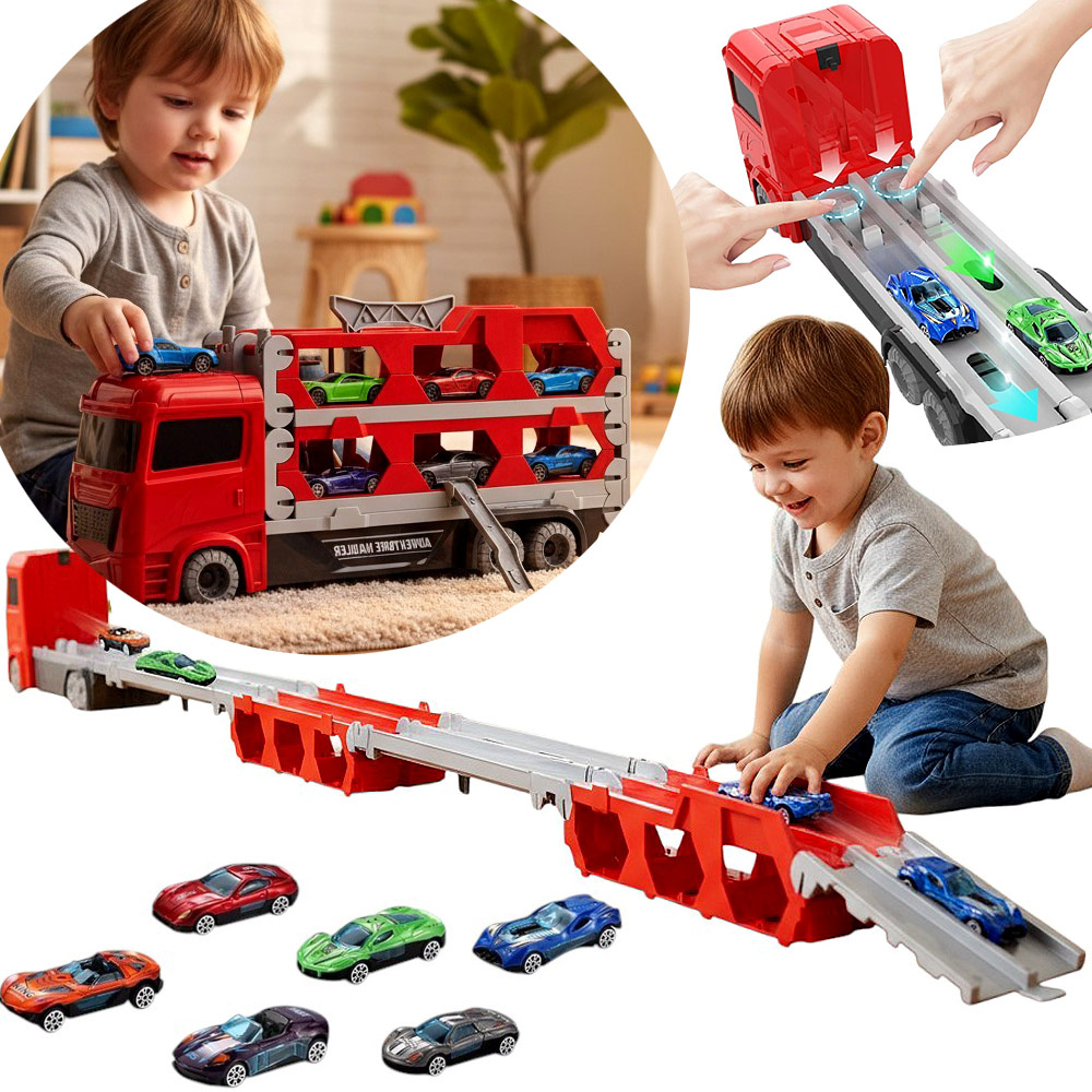 - Imponujący zestaw ciężarówki-TIR 7w1 o długości ok. 1,65 m – potężną lawetę-transporter, która rozkłada się, pełni funkcję toru samochodowego, i zawiera komplet autek. Rozłożony tor samochodowy jest dwutorową konstrukcją i każdy z 2 torów posiada na starcie wyrzutnie (sprężynową), dzięki temu możesz urządzać wyścigi z kolegami.