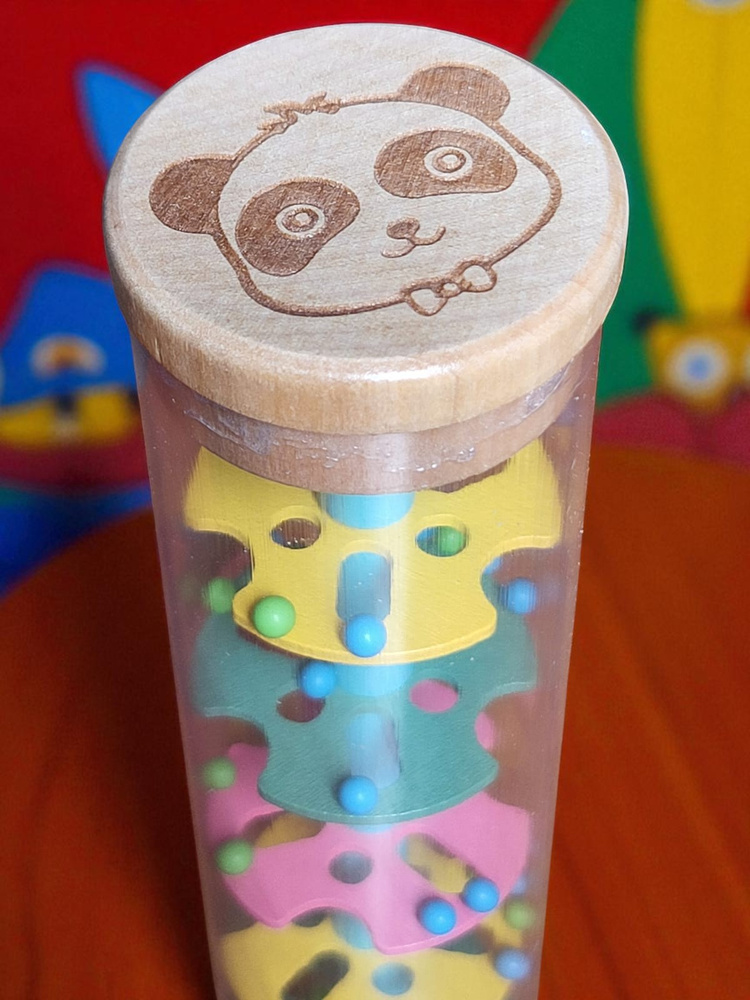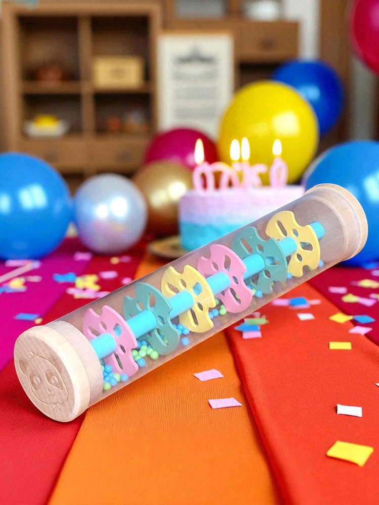 1. Wszechstronność: działa zarówno jak grzechotka – przy potrząsaniu, jak i rainstick – przy obracaniu tuby. Można swobodnie zmieniać styl zabawy.