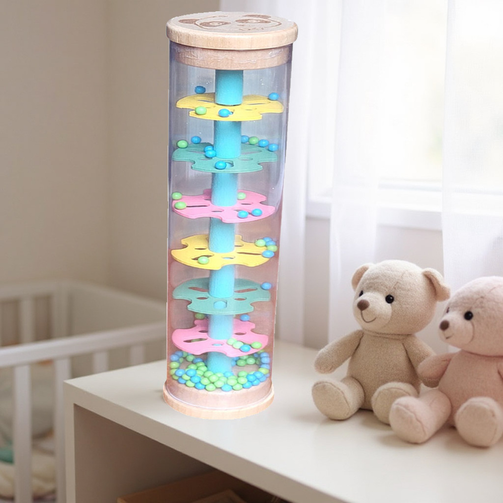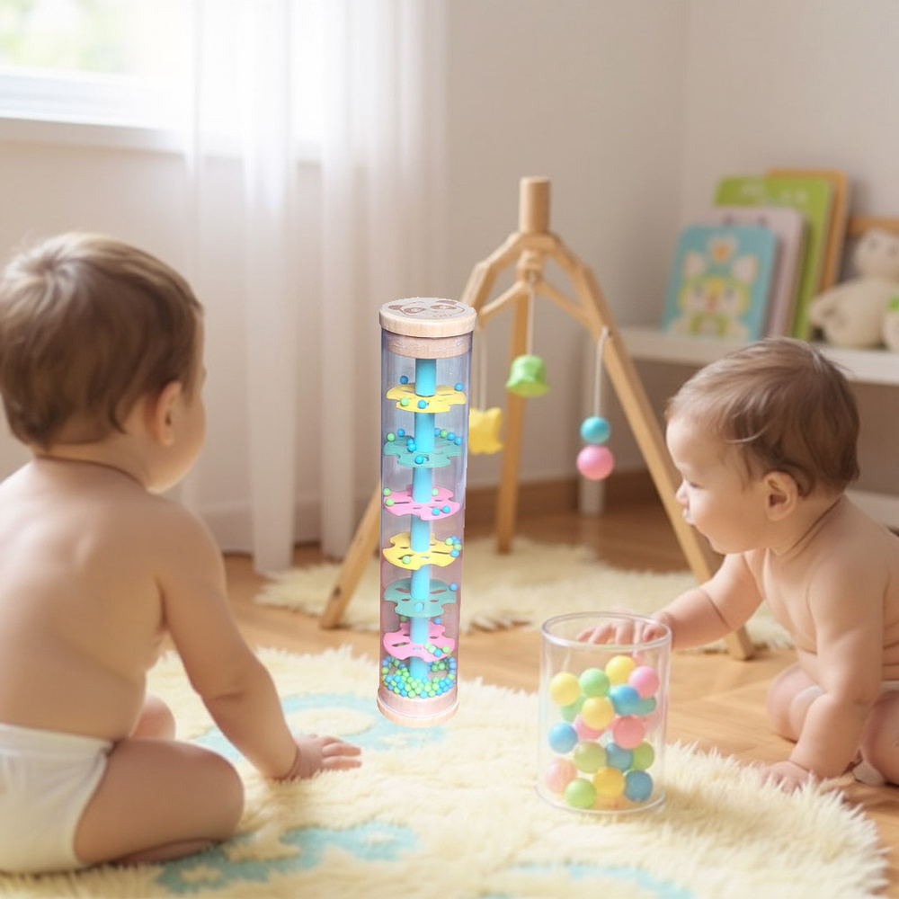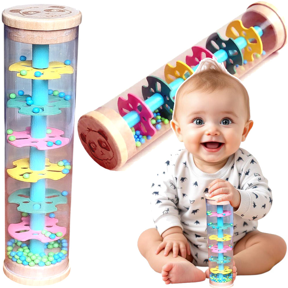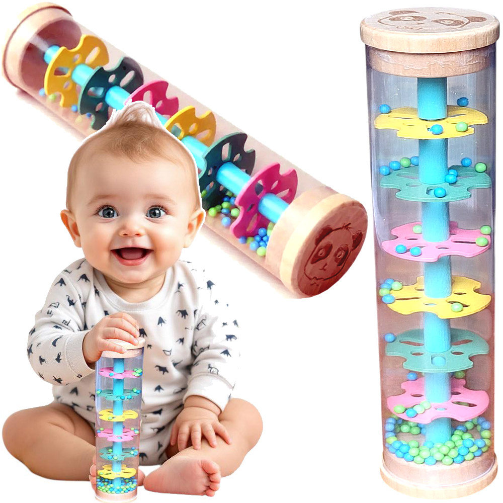• Efekt "deszczowy": przesypujące się kuleczki w tubie imitują dźwięk deszczu, co działa kojąco i przyciągająco dla maluchów.