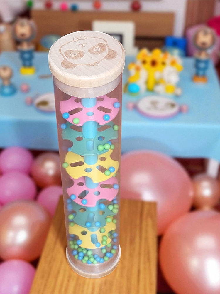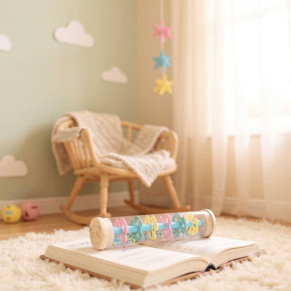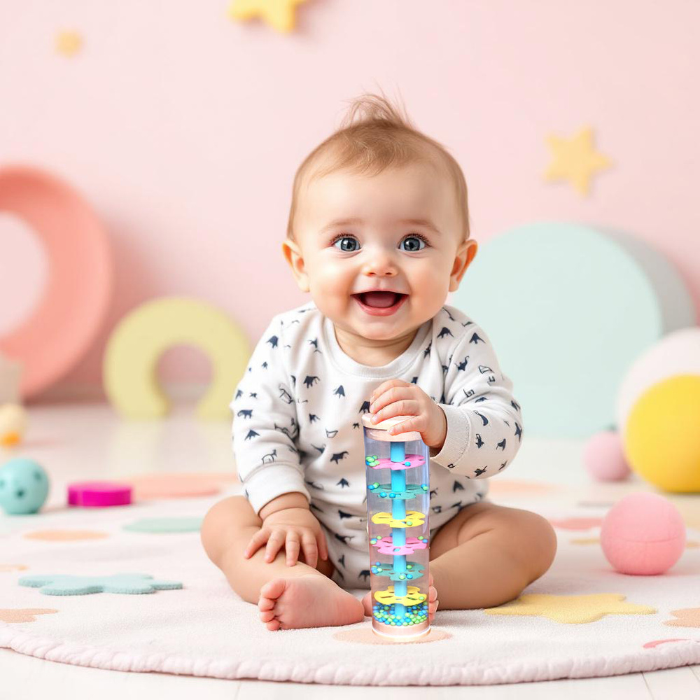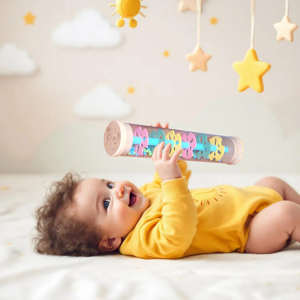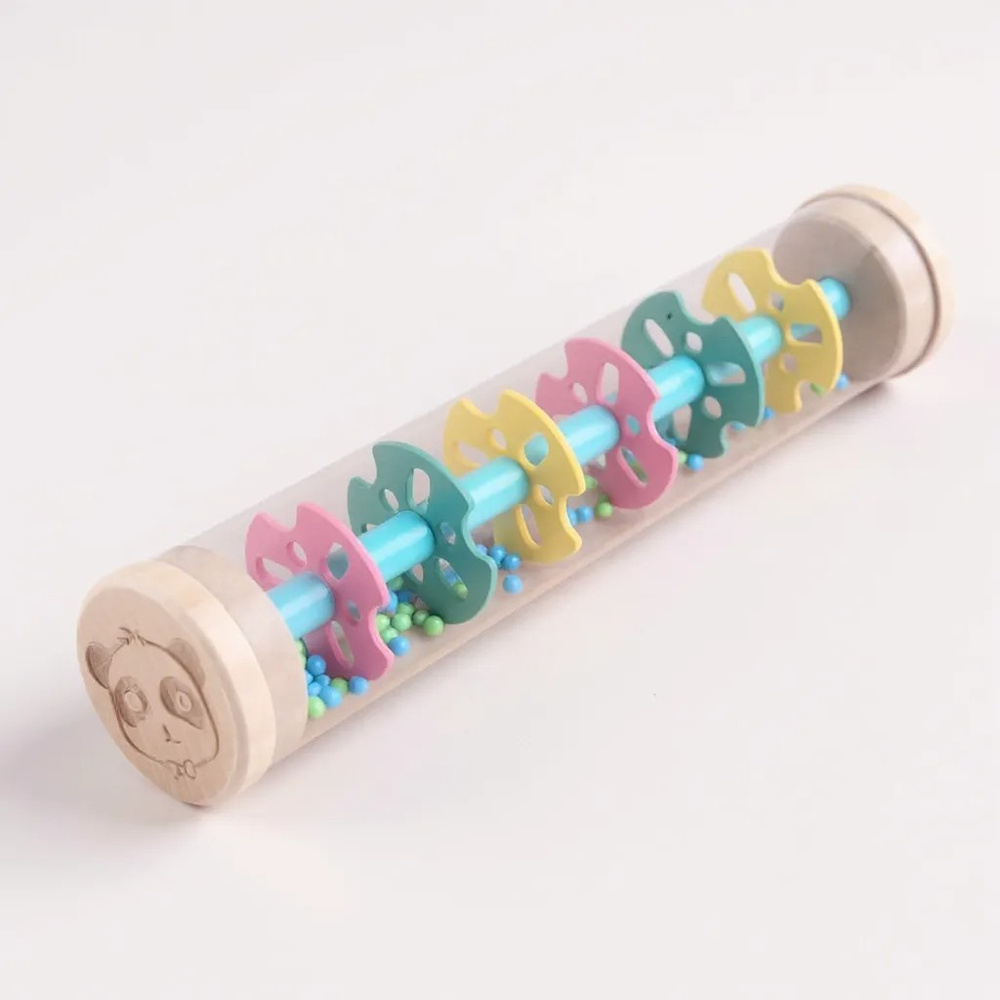 • Efekt "deszczowy": przesypujące się kuleczki w tubie imitują dźwięk deszczu, co działa kojąco i przyciągająco dla maluchów.