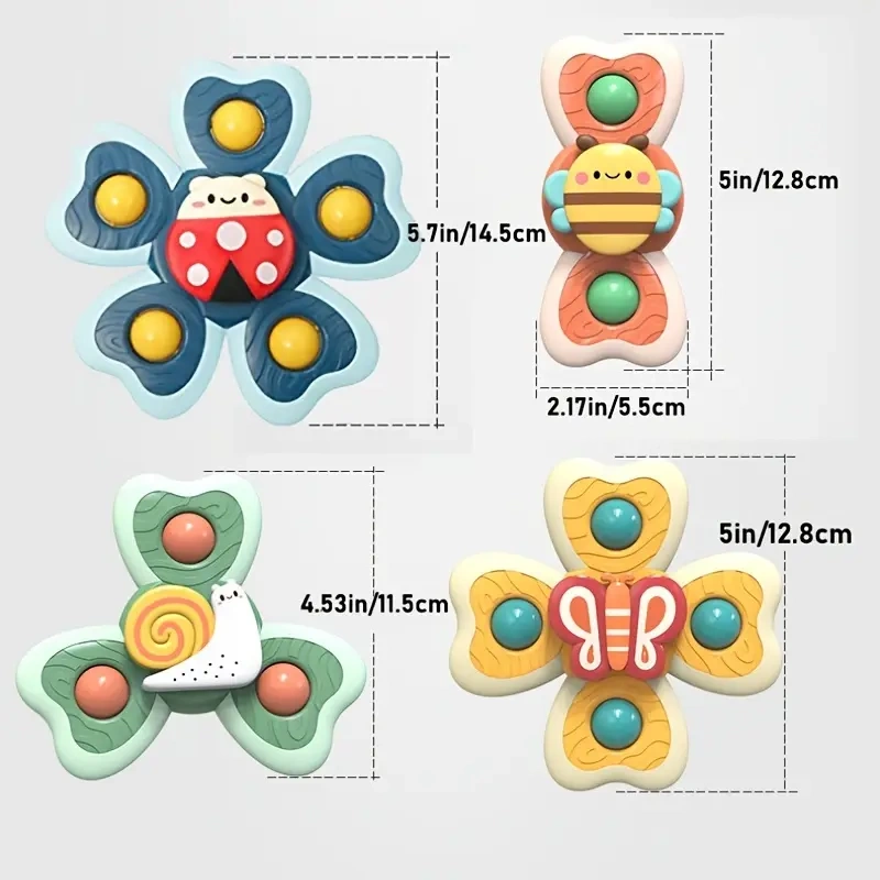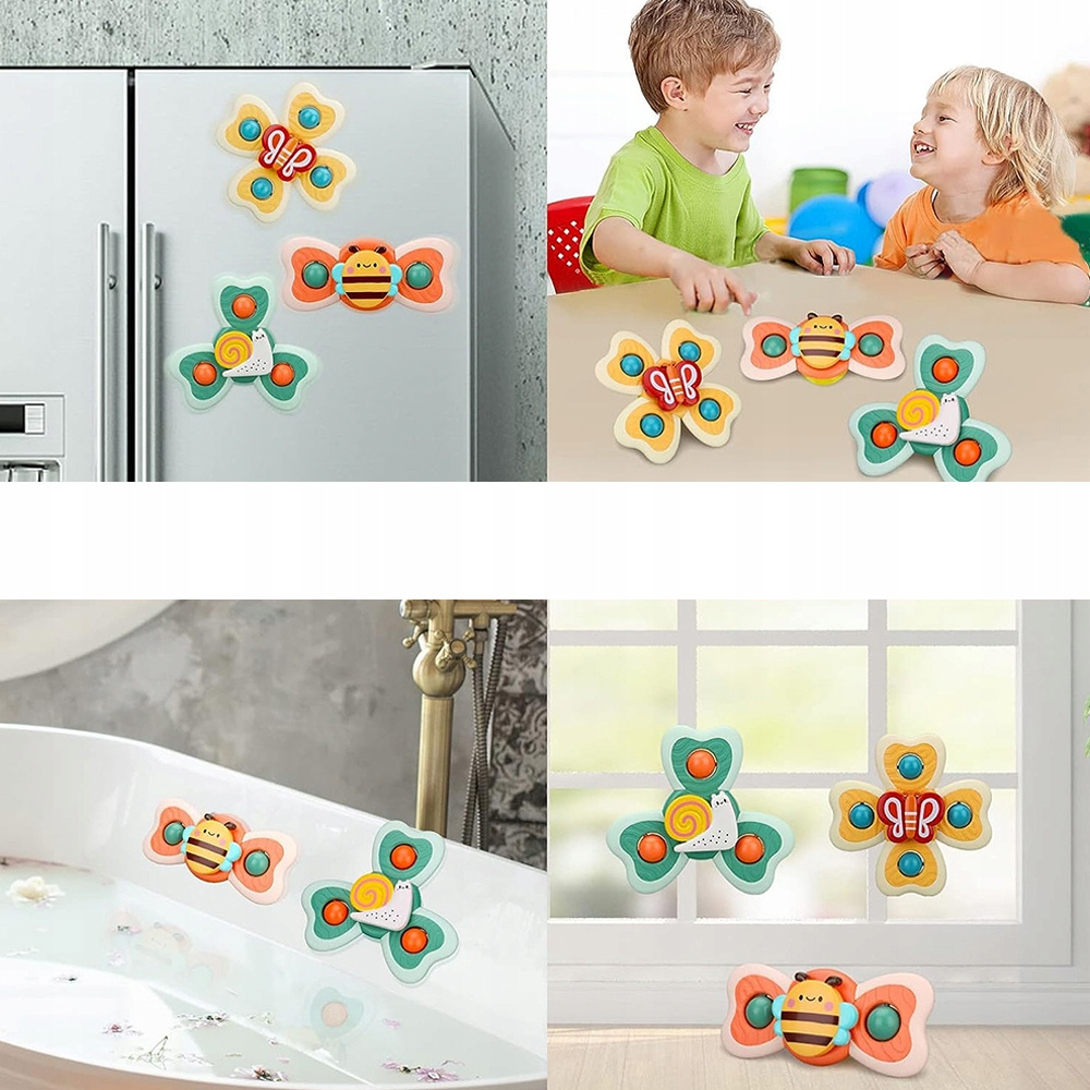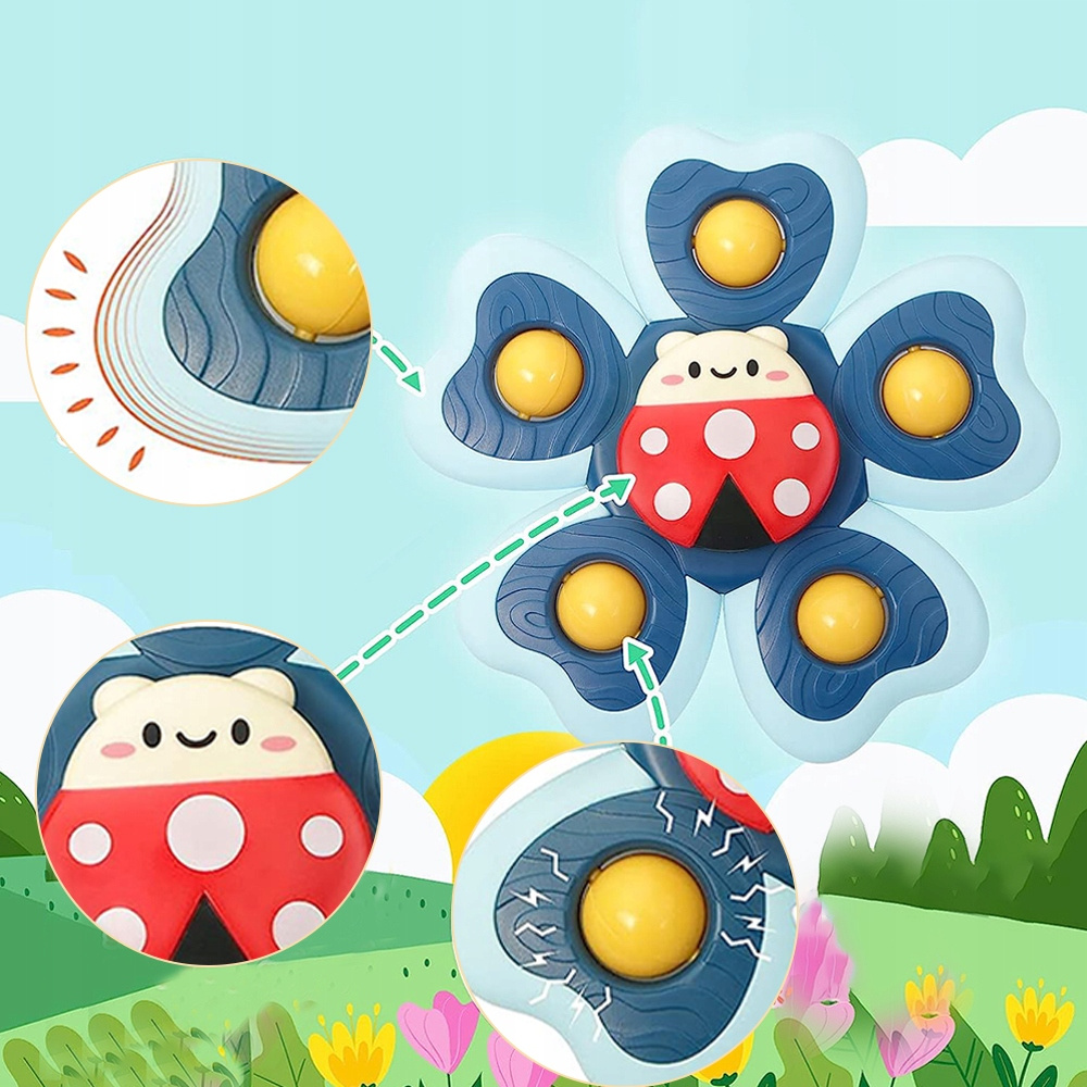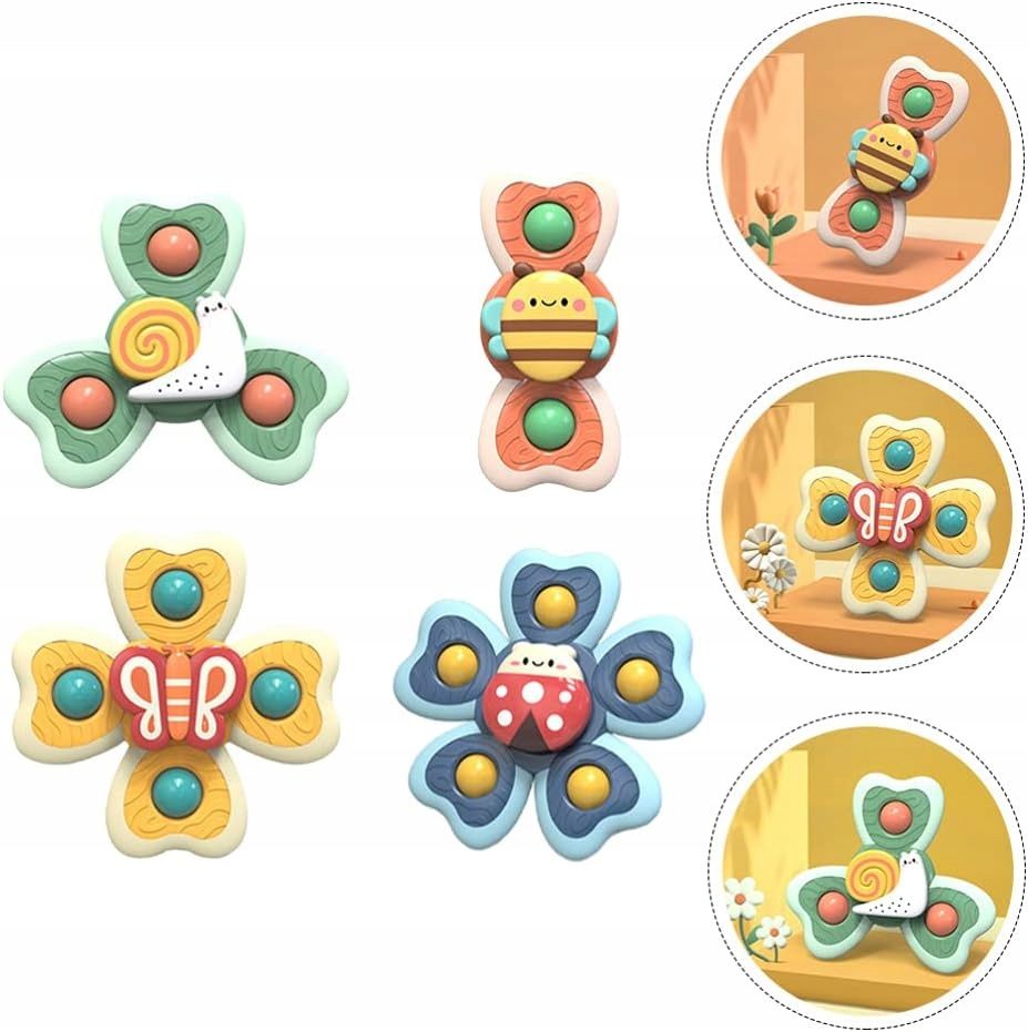 Wirujące Grzechotki Spinnery to zestaw trzech zabawek z uroczymi figurkami owadów (biedronki, ślimaka, motylka i pszczółki), które można przymocować do różnych powierzchni dzięki przyssawkom.