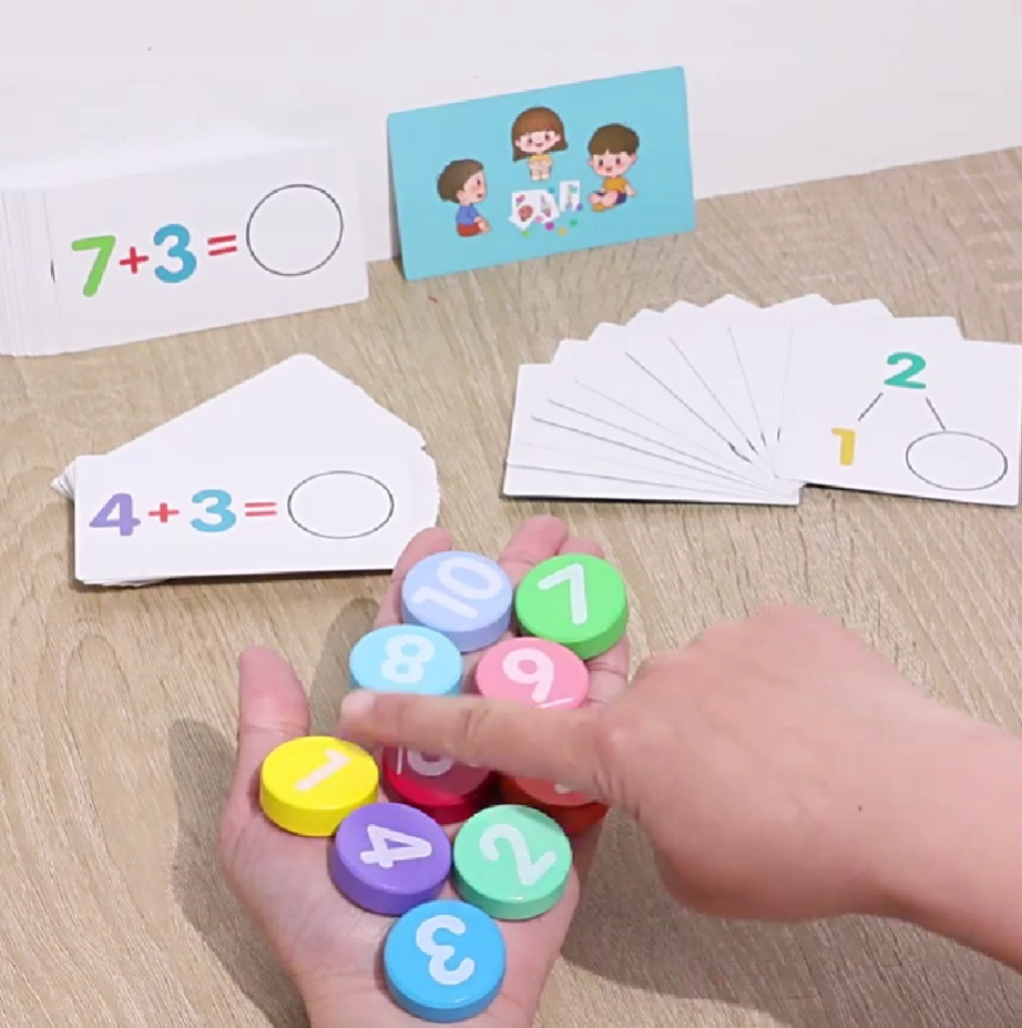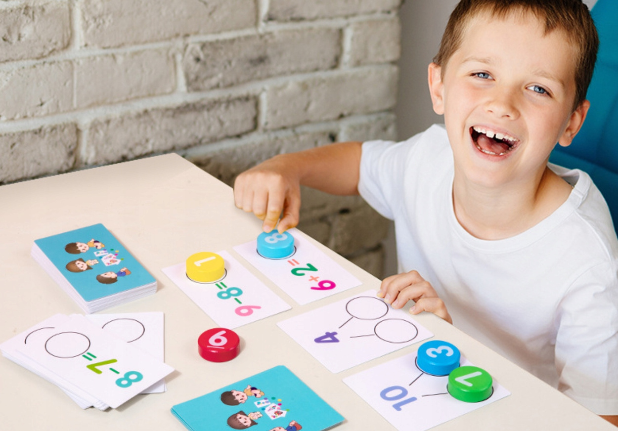 Dziecko losuje kartę z zadaniem (np. „3 + 2 = ?”).