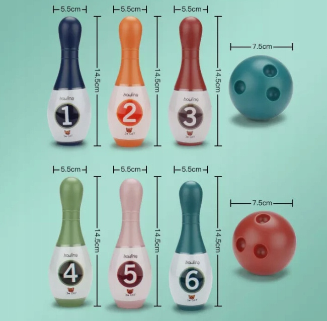 Wymiary elementów: kręgiel ok. 14 cm wysokości, kula dostosowana do wielkości dziecięcej dłoni