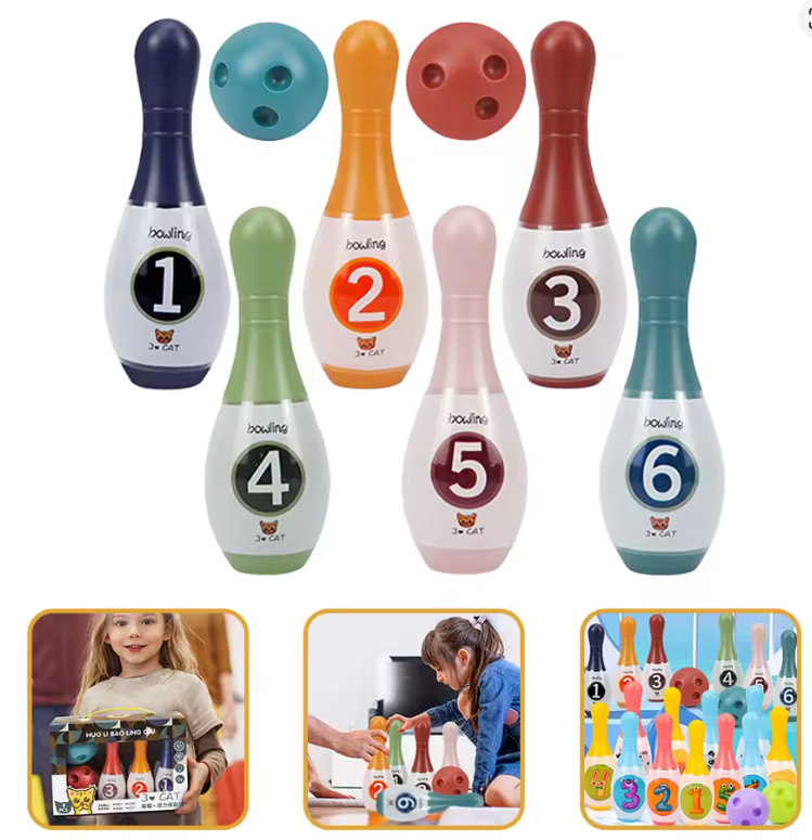 Kręgle wykonane z wytrzymałego plastiku, oznaczone certyfikatem CE, przeznaczone dla dzieci 3+, z elementami kolorystycznymi ułatwiającymi naukę liczenia.