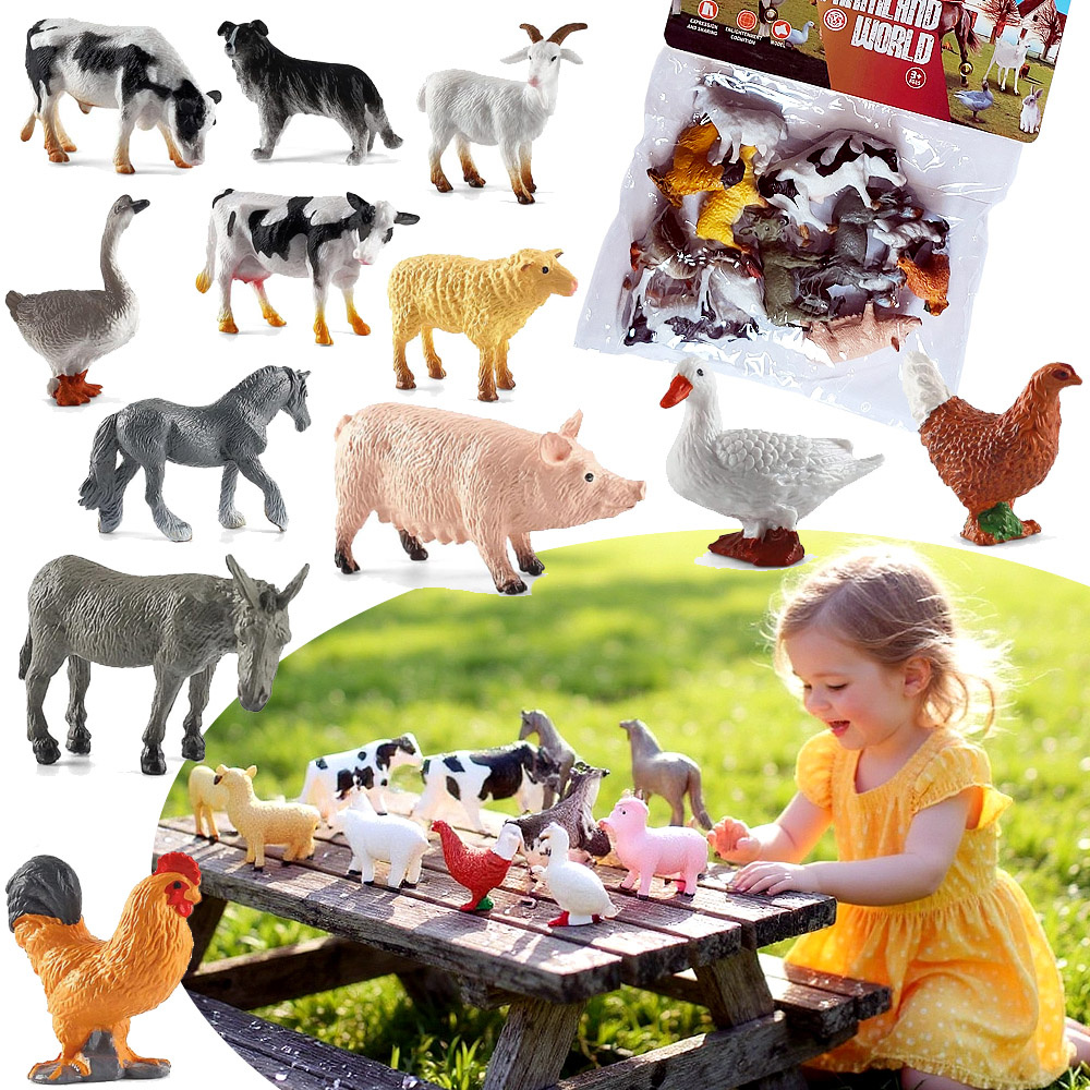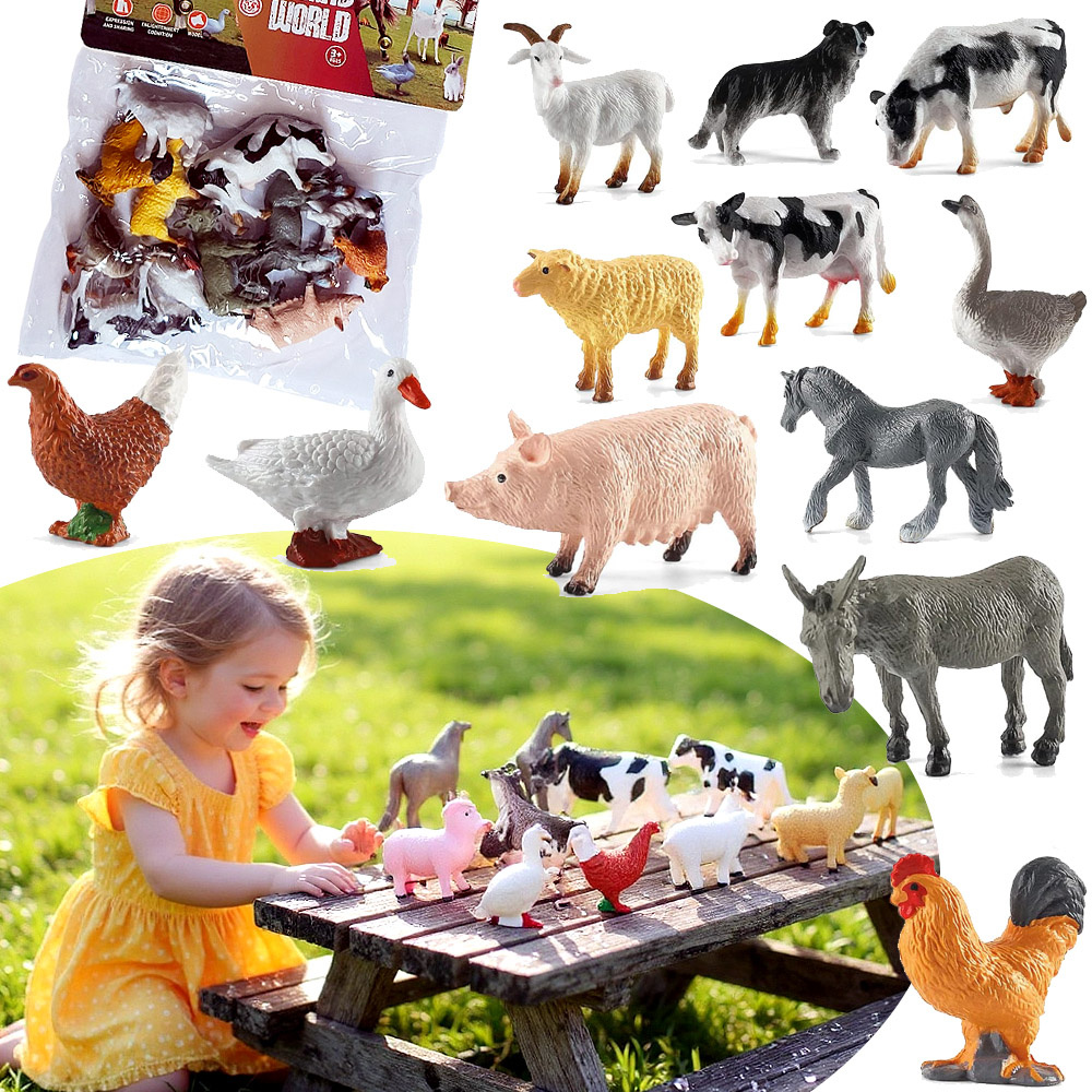 Poznaj zestaw farmy: 12 figurek zwierząt domowych w opakowaniu, certyfikat CE, wiek 3+. Edukacyjna zabawa w gospodarstwo – idealny prezent dla chłopców i dziewczynek.