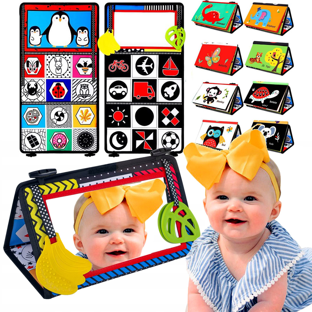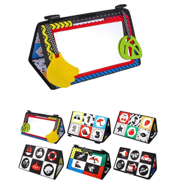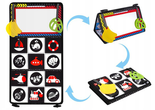 - Książeczka kontrastowa z lusterkiem dla niemowląt jest idealnym rozwiązaniem dla rodziców, którzy szukają zabawki edukacyjnej wspierającej rozwój wzroku, dotyku i koordynacji ruchowej.