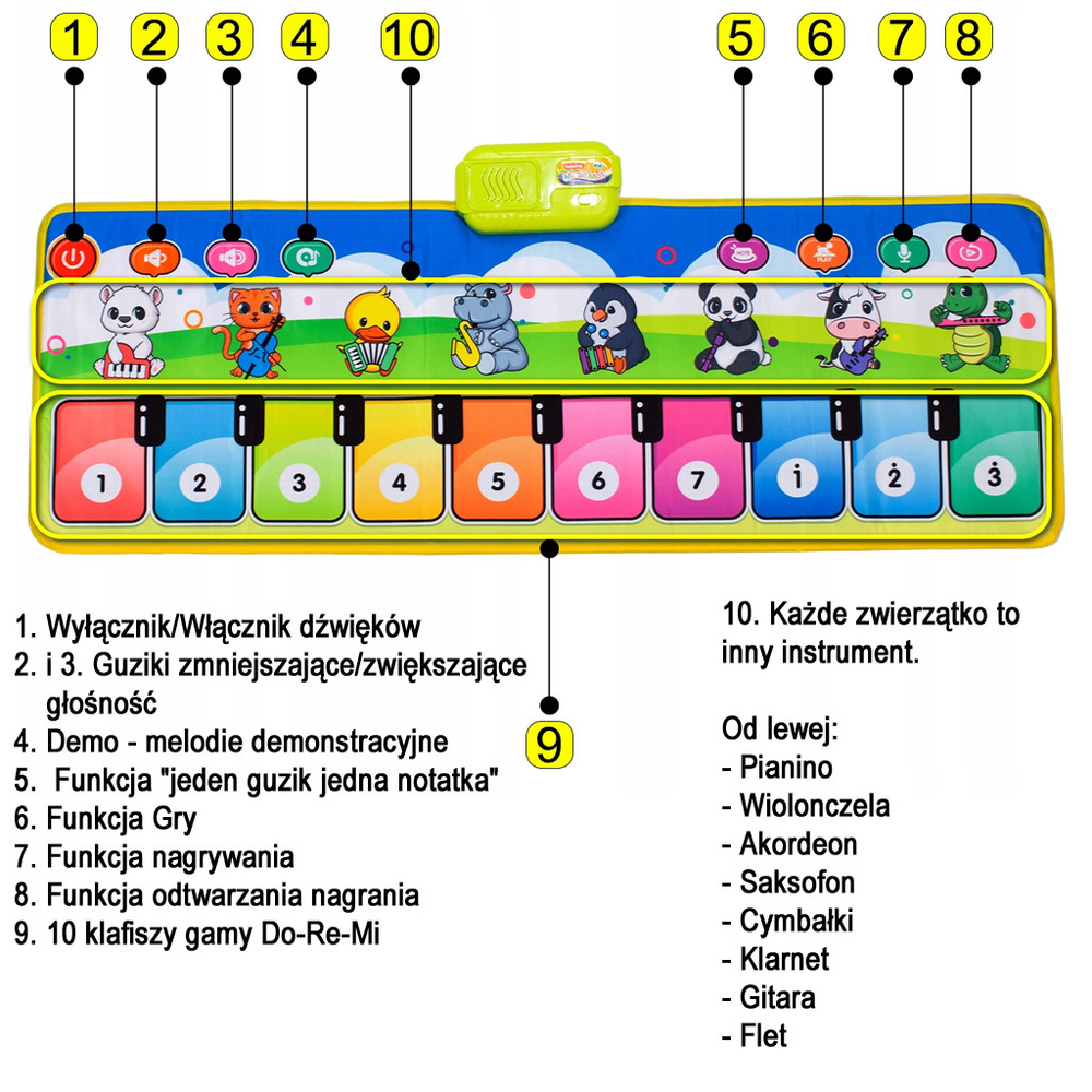 - 10 dźwiękowych klawiszy gamy Do-Re-Mi