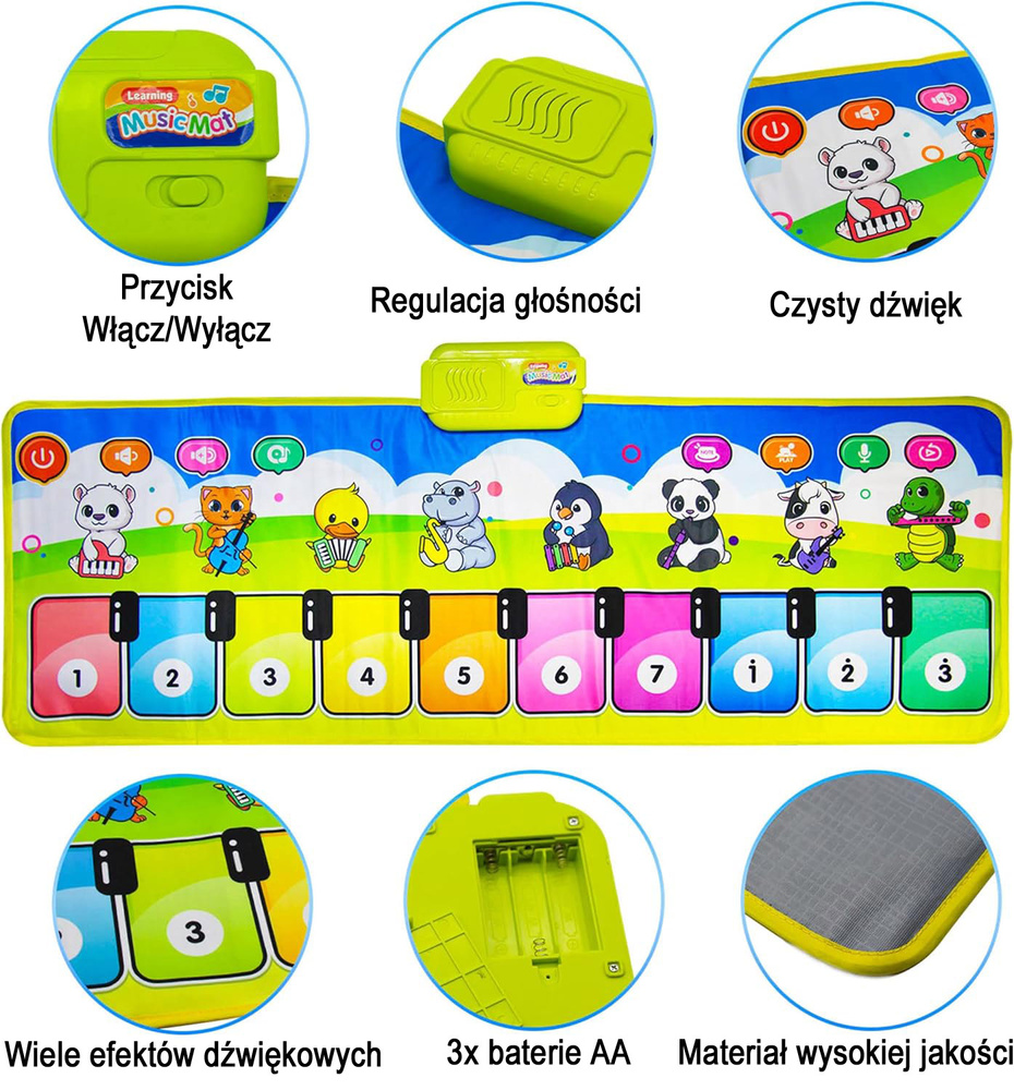 - Mata muzyczna interaktywna z funkcją nagrywania dźwięku, efekty świetlne i instrumenty – idealna zabawka edukacyjna dla dzieci od 3 lat. Duża, bezpieczna i angażująca.