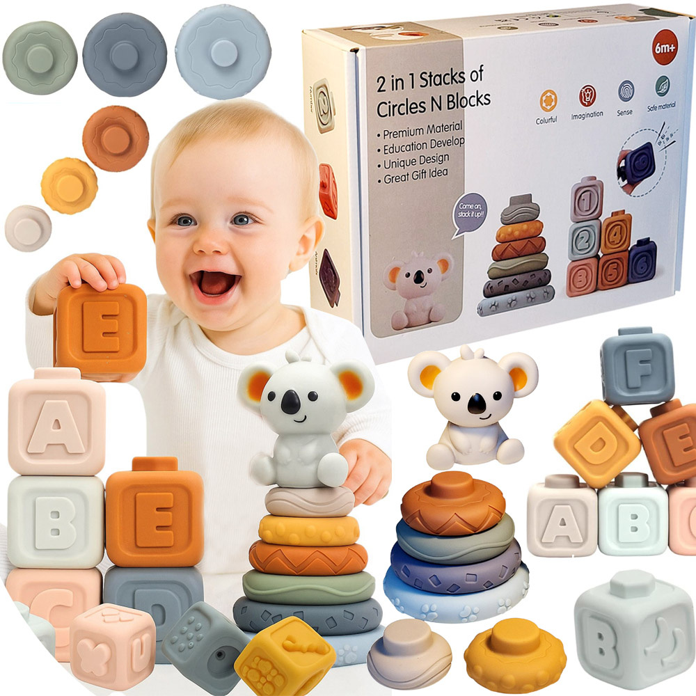 Klocki sensoryczne miękkie gumowe + gryzaki – kreatywny zestaw wieża dla dzieci 6m+