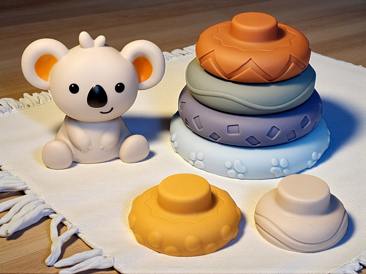 Materiał PVC użyty do produkcji klocków i krążków jest miękki, elastyczny, bezpieczny – można ściskać, gnieść oraz używać jako gryzaki, co pomaga dziecku w fazie ząbkowania. Takie cechy są bardzo ważne, ponieważ umożliwiają zabawę bez ryzyka uszkodzeń jamy ustnej czy podrażnień skóry. - Stymulacja zmysłów: