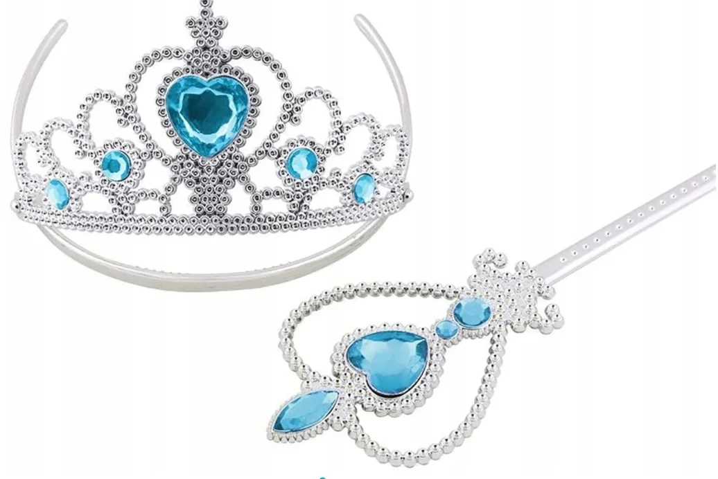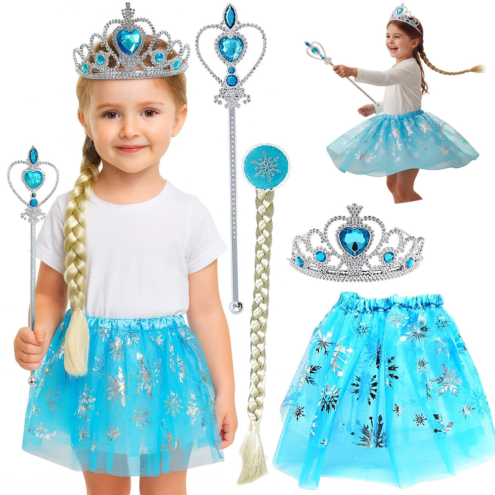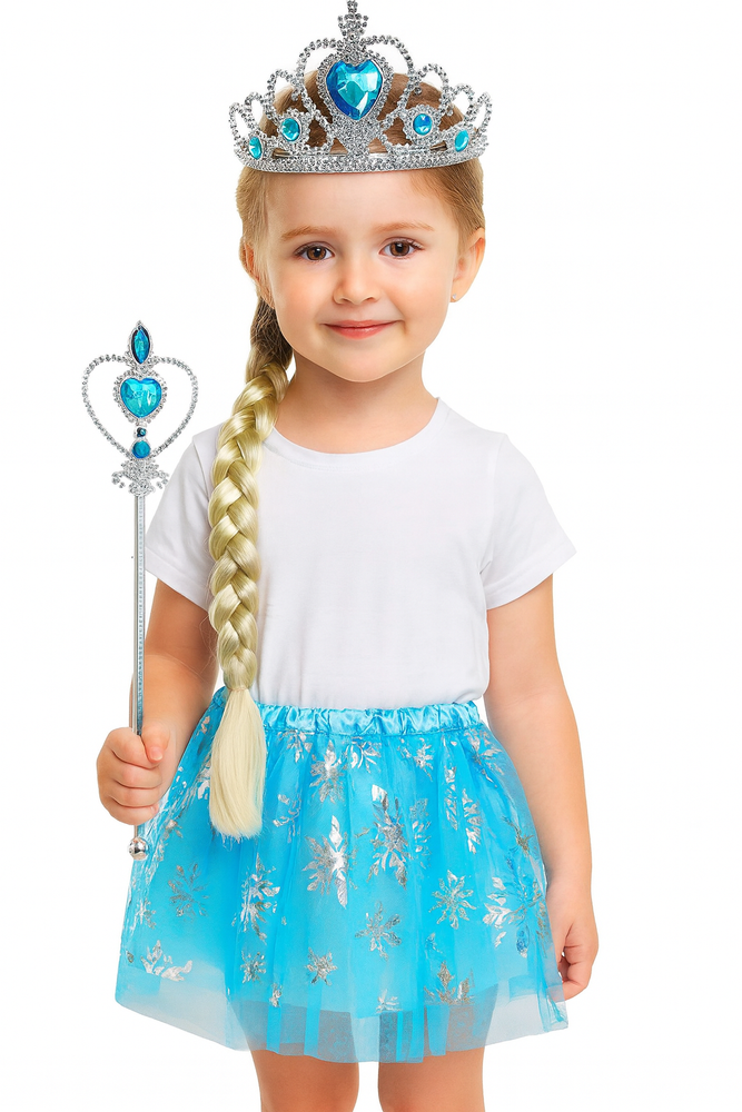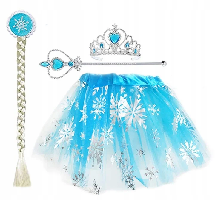 - Kostium 4w1 – błękitna tiulowa spódniczka, jasny warkocz, korona i różdżka. Idealny strój księżniczki lodu dla dziewczynek od 3 roku. Świetny prezent na bal przebierańców.