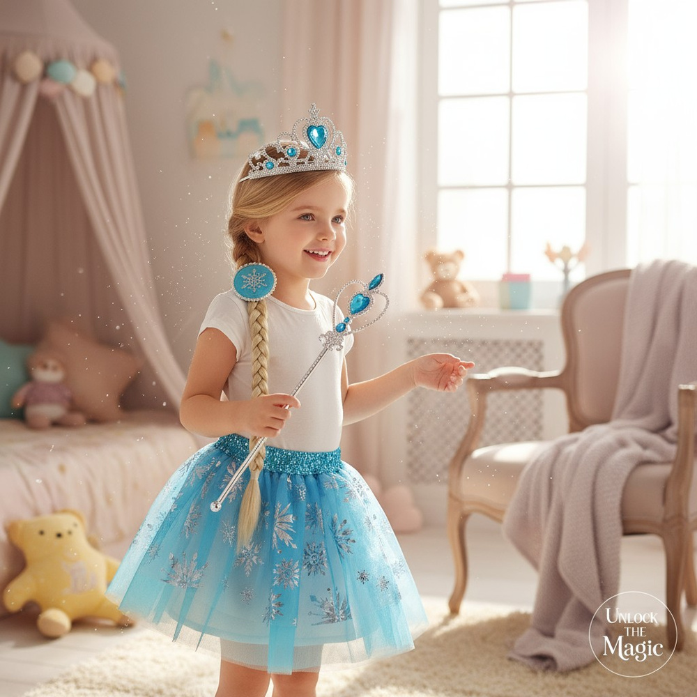 Wyjątkowy zestaw 4w1 dla małych fanka Księżniczki — idealny kostium inspirowany postacią z bajki. W komplecie znajduje się tiulowa spódniczka, jasny warkocz, korona oraz różdżka – wszystko skomponowane, by dziecko poczuło się jak lodowa królowa.
