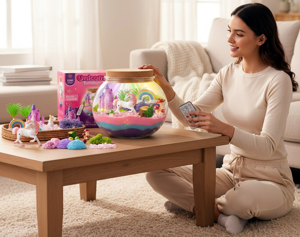 - Terrarium świecące z jednorożcem to coś więcej niż dekoracja – to interaktywny zestaw kreatywny, który łączy elementy DIY, eksperymentów, dekoracji i funkcję lampki nocnej. Dzięki 13 kolorom oświetlenia LED i licznym akcesoriom, produkt pozwala na stworzenie własnego, magicznego świata.