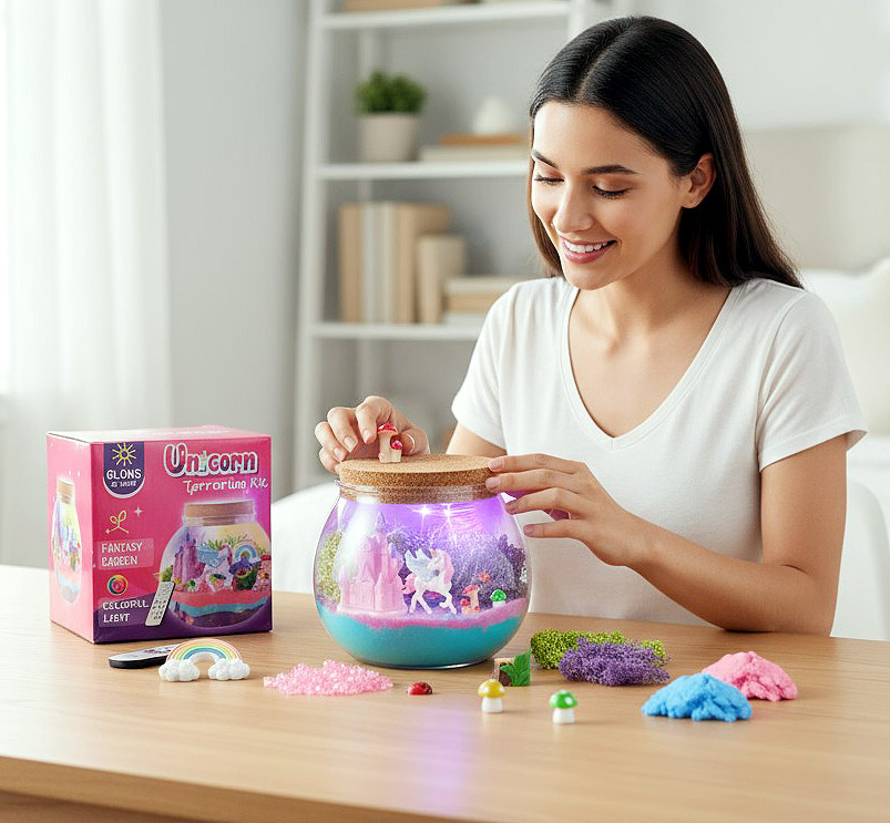 - Terrarium z jednorożcem, lampka LED w 13 kolorach, zestaw kreatywny DIY z eksperymentami – idealny prezent, rozwój ręki-oka, nauka przez zabawę, bezpieczne materiały.
